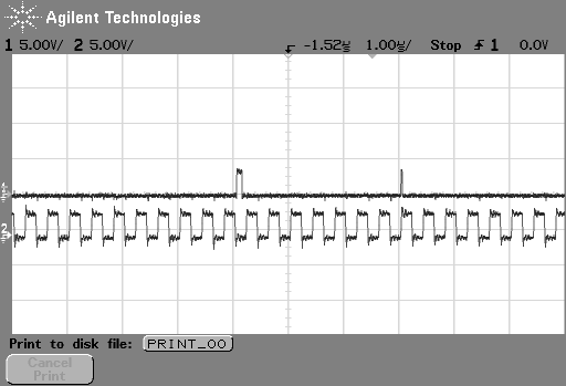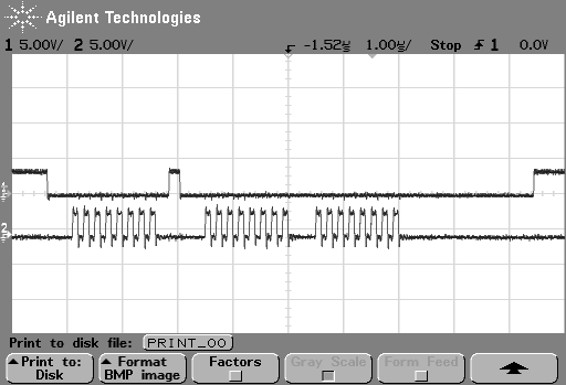 Hi, hatte gestern mal das Oszi dran und konnte herrlichen Ausdruck mit Folgenden Einstellungen machen (siehe Anhang 1, oben Chipselect (aktive low) und der untere Graph beinhaltet den SPI Clock) - PLL aus - 10Mhz Quarz - SPI Mode 3 - CPU Pins korrekt konfiguriert - Beide SPI Prescaler auf 1:1 (was laut Datenblatt vermieden werden sollte) Beim zweiten Versuch habe ich PLL aktiviert, (PLL funktioniert bisher tadellos, da ich schon länger mit aktiviertem PLL arbeite) und den Sekundären SPI Prescaler auf 1:16 gestellt. Ergebnis (siehe Anhang 2): SPI Clock und der Chipselect passen irgendwie nicht mehr zusammen. Daher kein Einlesen mehr möglich, auch wenn ich die vom Datenblatt geforderten zeitlichen Pausen hinzufüge bekomme ich kein Daten mehr. SPI Init Funktion