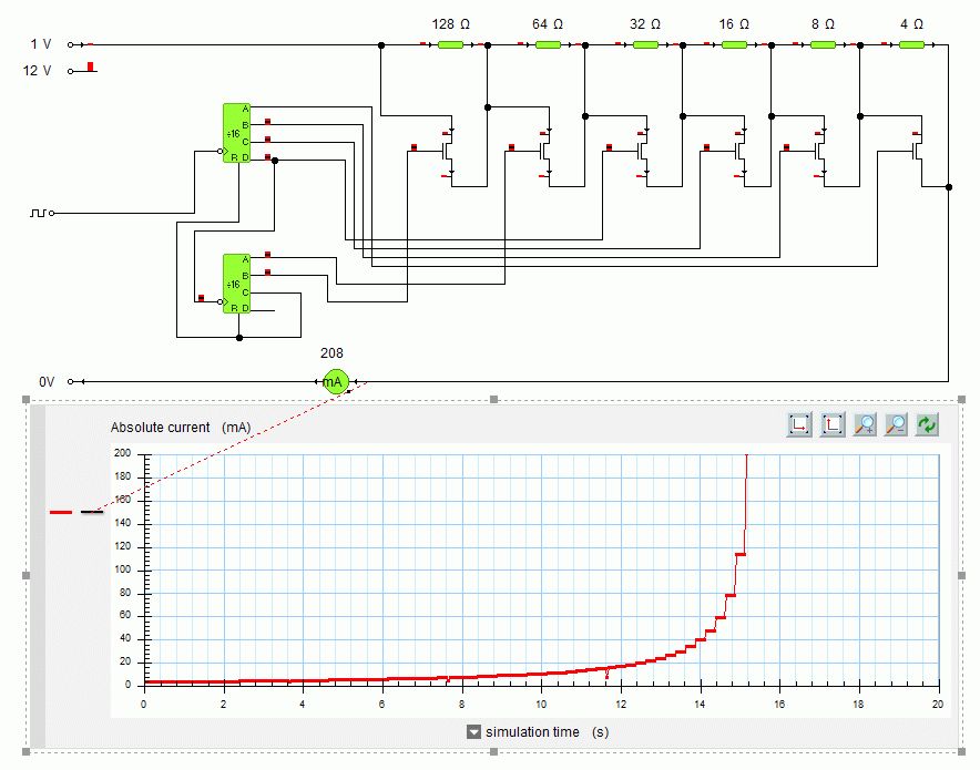 >> Es gäbe eine Möglichkeit einfach eine reihe Von Widerständen (z.B. 1 >> Ohm, 2 Ohm, 4 Ohm ,... 256 Ohm parallel zu schalten - jeweils mit einem >> MOSFET. > > 8 in reihe, jeweils parallel dazu transistor, sieht zwar mit schaltern > ganz nett aus, wie soll das aber mit transistorn funzen, da stimmen doch > die ganzen spannungs/stromverhältnisse nichtmewhr oder? also (ube) ich hab das ganze mal simuliert und es ist so wie ich mir gedacht hab. das ganze funzt nur wenn man (von + nach -) die widerstände von gross nach klein anordnet und wenn die messpannung (und damit der strom) sehr klein ist sonst funzt es nichtmehr und Ugs ist zu klein bei den höheren widerständen. ich hab mal meinen versuch angehängt