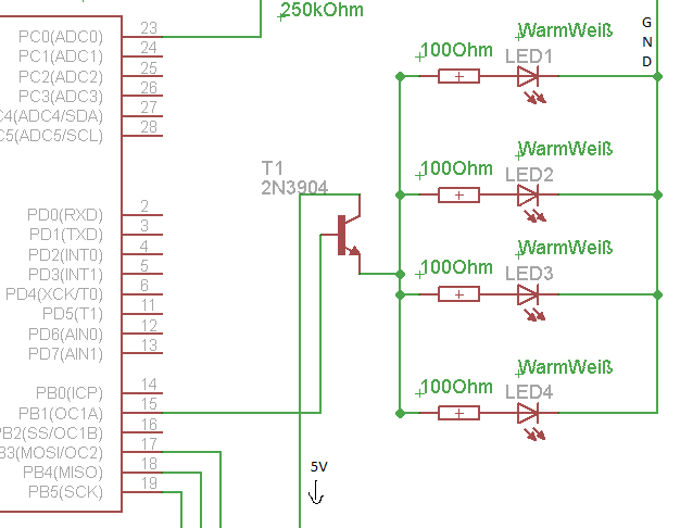 Hallo, ich habe eine Schaltung, wo 4 LED's über einen µC langsam gedimmt werden. Wie im Bild zu sehen ist, würde ich das gerne über einen Transistor steuern, um den µC nicht so sehr zu belasten und weil ich da nur einen Port als Ausgang habe. Ich noch nie mit Transistoren groß gearbeitet habe und wollte deshalb Fragen, welchen Transistor man dafür am besten hernimmt? MFG Max