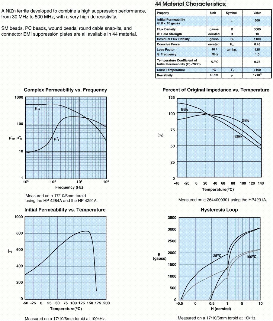 Material 44 sagt mir direkt nichts, wenn ich aber direkt im Datenblatt etwas von 'NiZn ferrite' lese, wird es sich wohl um einen Mu-Metall abkömmling handeln; auch unter dieser Bezeichnung werden ja mehrere Legierungen geführt. Das wäre dann auch die Antwort auf deine Frage: Mu-Metall (oder auch µ-Metall) Wenn Dir die Schirmungseigenschaften herkömmlicher Materialien nicht ausreichen (Messing, Kupfer, Aluminium - oder wenn es auch darum geht niederfrequenze H-Felder abzuschirmen: Weißblech) wird Mu-Metall interessant. Dafür finden sich auch etliche Hersteller und Lieferanten. dort bekommst Du dann auch Datenblätter für das jeweilige Material. WAS Du allerdings wirklich brauchst, kann Dir keiner ohne weitere Einblicke in Deine Applikation sagen - denn nur das Material ist nicht alles, ebenso wichtige Aspekte sind die mechanische Parameter (Materialstärke, Abstände, ...), welcher Frequenzbereich überhaupt abgeschirmt werden soll, ob Störsignale von draußen ferngehalten werden sollen oder ob im Gerät erzeugte Signale nicht hinaus gelangen sollen, usw... Nur auf ein supertolles Schrim-Material zu setzen, führt nicht unbedingt zum Erfolg. Nebenbeibemerkt stellt auch gerade Mu-Metall gewisse Anforderungen an die Bearbeitung, so muss es z.B. nach der mechanischen Bearbeitung getempert werden um seine typischen Eigenschaften wiederzuerlangen - es ist widerspenstig und zäh bei der Bearbeitung, schlecht zu zerspanen und schwer zu schweißen - und zudem noch sehr teuer! Man möchte es also nur benutzen, wenn man es tatsächlich, unabdingbar benötigt! Wenn Du wirklich Hilfe bei der Auswahl eines geeigneten Schirmmaterial für deine Anwendung suchst - gib' ein paar detailiertere Einblicke! Grüße Sascha