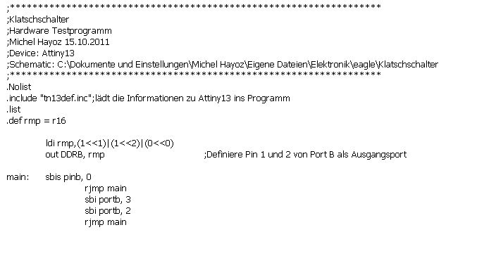 Hallo zusammen, Ich bin ein Microcontroller Neuling. Und als Übungsprojekt habe ich mir einen Klatschschalter ausgedacht und aufgebaut. Nun habe ich meinen Attiny13 mit einem minimalen Testprogramm beschrieben, um die Platine zu überprüfen. Auf dem STK500 funktionierts auch. Nur bei der Platine funktioniert das Testprogramm jedoch nicht. Die Verkabelung ist korrekt, die Ausgänge habe ich einzeln getestet; sind ok. An was könnte es liegen? P.S. für den Test habe ich den tl072 entfernt und einen Taster an den PIN 7 gelegt.