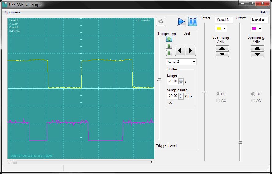 a) Ich selbst: vor ca. 4 Jahren habe ich begonnen mich mit AVR Controller zu beschäftigen und habe einen preiswerten Programmer gesucht nachdem ich herausgefunden hatte, dass das AVR-Studio mit dem GCC Compiler so zusammenarbeitet, dass man nicht gezwungen ist mit dem AVR-Studio in Assembler zu prgrammieren. Das "AVR-GCC-Tutorial" bei Microcontroller.net hat mir beim Einstieg sehr geholfen. b) Ich habe mir einen "USB AVR Lab" gekauft. Der hat in Verbindung mit einem ATMEGA 32 auf einem B-Control Board (http://www.nettypes.de, Martin Kaupp, leider nicht mehr "aktiv") und dem damals von mir verwendeten AVR-Studio auch funktioniert. Nach einem defekten Mainboard auf meinem PC, viel Ärger und neuer Installation des dann aktuellen AVR-Studio hat sich der "USB AVR Lab" betrieben als Programme nicht mehr als kompatibel mit dem AVR-Studio erwiesen. Siehe Beitrag "Re: AVR Studio 4.18 AVRISP mkII". In diesen Wirren und dem Verdacht, dass ich den USB AVR LAb beschädigt haben könnte habe ich mir einen zwiten gekauft. Das hat dann leider nicht geholfen, und ich habe einen Original "AVRISP mkII" gekauft (ca. 38 Euro). Das war dann wirklich die Lösung. Nachdem ich die 2 "USB AVR Lab" nicht mehr als Programmer verwenden wollte, plante ich diese als Oszilloskope zu verwenden. Die Idee ist ja auch wirklich gut, und zum debuggen von Signalen kann ein einfaches "Speicheroszi" mit 2 Kanälen ja auch wirklich nützlich sein - wenn es funktioniert. c) Der weitere Bericht beschreibt Versuche mit folgeden Komponenten: 1. USB AVR Lab Hardware, 2 Stück 2. SW zum Laden der Oszi Firmware 1040_avrlabtool_i386-win32-5.10.exe 3. Windows Programm mit dem die Oszi Funktion ausgeführt wird 1851_usbavrlaboszi_i386-win32-0.6.exe 4. PC mit Windows 7 Home Premium 32 Bit-Betriebssystem, + SP1 5. Spannungsteiler (10 Gang-Poti)und Schutzdioden-Anrodnung Zenerdiode 10V, 1N4148 als Schutzbeschaltung für zu große und negative Spannungen in 2-facher Ausführung. d) Versuchsdurchführung und Ergebnis Hardware: Mit dem Spannungsteiler habe ich bei dem älteren USB AVR Lab den Spannungsteiler so abgeglichen, dass die Anzeige einer Gleichspannung auf dem Bildschirm mit einem Digital Multimeter übereingestimmt hat (=Abgleich). Das habe ich an beiden Oszi-Vorsätzen gemacht. Dann habe ich den neueren USB AVR LAB angeschlossen und untersucht, ob der sich denn gleich verhält. ==> Warum auch immer, mit dem neueren USV AVR Lab ist die angezeigte Spannung nur ca. 0,15V den ersten hatte ich auf die richtigen 2V abgeglichen. Der Eingangswiderstand ist offensichtlich arg unterschiedlich. Kein Problem, man muss eben den Spannungsteiler auf den individuellen USB AVR Lab anpassen / abgleichen. Damit denke ich kann man leben. Wie das bei dem angebotenen Vorsatz mit 100 kOhm Widerstand und 2 Dioden funktioniert weiß ich nicht. e) Ergebnis Software: 1. Mit der Treiberinstallation hatte ich zunächst Probleme irgendwann hat es aber dann geklappt (leider kann ich nicht berichten warum). 2. Die Installation des Firmware-Lade-Programms "USB AVR LAB Tools" und der Oszi Software "USB AVR Lab Scope" war absolut unproblematisch. 3. Der neuere USB AVR Lab wurde zwar erkannt, konnte aber nicht in den Bootmodus versetzt werden. Mit der Beschreibung "Bootloadermodus erzwingen" (=auf dem USB AVR Lab den Pin PC2 auf Masse legen während dem Anstecken des USB-Kabels) konnte ich die Hardware mit der Oszi Firmware laden. Jetzt hatte ich beide USB AVR Lab mit Oszi Funktion verfügbar. 4. Das Windows Programm "USB AVR Lab Scope" macht einen sehr aufgeräumten jedoch noch nicht reifen Eindruck. Ich wünsche mir Bedienungshinweise, weil ich außer der Time-Base (Zeit), Spannung/div und Offset nichts richtig bedienen kann. Entweder ich durchschaue es nicht, oder es funktioniert bei mir nicht. Wenn ich beide USB AVR Lab anschließe, dann habe ich 2 mal Kanal 1 oder auch manchmal 2 mal Kanal 2, manchmal aber auch 2 unterschiedliche wie erwartet. f) Die Windows SW "USB AVR Lab Scope" im Einzelnen: 1. Ein stehendes Bild habe mit "Trigger Typ" "Trigger Level" nicht hingebracht. 2. Die erhoffte Funktion in Richtung Speicher Oszi ist in der Software sichtbar (Buffer Länge, Sample Rate) und am unteren Bildschirmrand einen Slider mit dem ich vermute, dass bei angehaltener Aufzeichnung die Graphen angeschaut werden können (sollen ?). Wie ich diese Elemente nutzen kann habe ich nicht herausgefunden. 3. Beim 2-Kanal Betrieb zeigen beide Graphen das gleiche an. Ich wollte eine TWI Kommunikation auf SCL und SDA darstellen. Ich hatte so viel Rauschen auf den Leitungen, so dass ich für eine weitere Bewertung einen Rechteckgenrator verwendet habe und Generator mit meinem Oszi Vorsatz and den USB AVR Lab mit einem BNC Kabel verbunden habe. Das Signal 10ms low, 15ms high macht 40 Hz, 4V Amplitude (mit analogem HAMEG HM204 Rauschfrei und mit stehendem Bild gemessen). 4. Optische Kleinigkeiten Das Feld "Sample Rate" ist für die Darstellung der Einstellung während der Verstellung zu kurz. Die Einblendung SPG/Div und Zeitablenkung sind so klein, dass ich die mir Größer im Einstell-Bereich wünsche. Die Offset Schieber sind gut. Als Vorschlag möchte ich ergänzen, dass eine "Ziel Linie" über den Bildschirm gehen sollte, wenn man die in der Höhe positioniert. Gleiches gilt für den Einstell-Schieber "Trigger Level". 5. Bei Einstellung Länge = 20,00 stimmt wohl die Abtastrate nicht. Das Impuls/Pausen-Verhältnis wird nicht richtig dargestellt. 6. Als ich die "Sample Rate" Richtung oberes Ende verstellt habe hat dies "plötzlich" den Offset beeinflusst. Höhere Sampling Rate hat möglicherweise zu einem gravierenden Fehler der Darstellung geführt. 7. Wenn man bei angehaltener Aufzeichnung am Offset verstellt, dann verschwindet die Anzeige der Aufzeichnung. 8. Als ich die Sampling Rate Höher als 20 (konkret auf 30, bei Länge =20) eingestellt hat das Impuls/Pausen-Verhältnis überhaupt nicht mehr gestimmt. Statt 10ms low 15ms high hatte ich 7ms low 12 ms high. 9. Manchmal zei