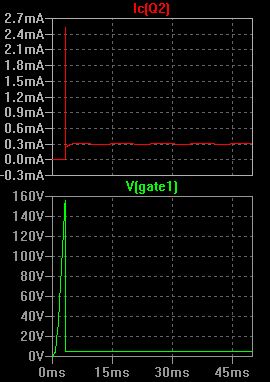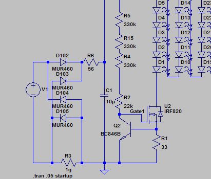 > und Tante Spice sagen doch! Stimmt auch. Solange die Netzspannung nicht groß genug für den entsprechenden Stromfluss durch die LEDs ist, solange ist Q2 inaktiv und die Gatespannung kann beliebig groß werden (Uces).