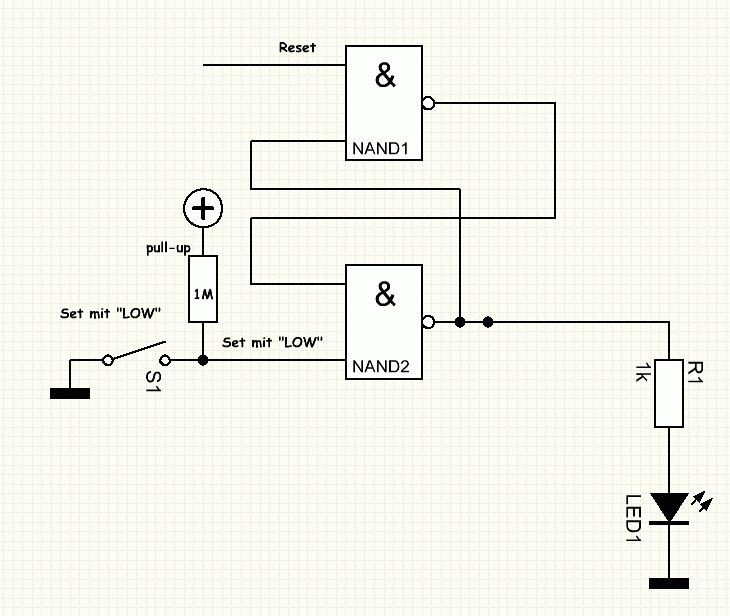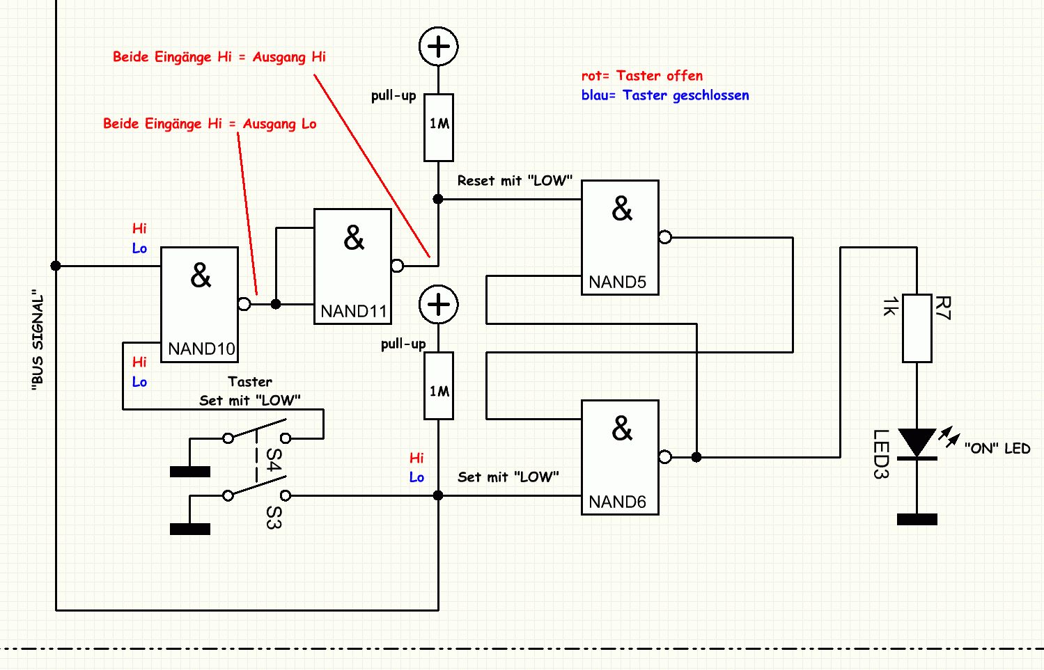 Ui! :-) Das macht einen guten Eindruck! Jetzt verstehe sogar ICH das!? :-) Hab mal die zugehörigen Pegel und die 3 möglichen Zustände durchgespielt (siehe Anhang). Kann der PullUp am Set Eingang nicht entfallen? (weil... da ist ja noch der PullUp auf dem Bus, Diode in Durchlassrichtung... dann liegt der Hi-Pegel doch am FF an, oder?) Und am Reset Eingang vom FF? braucht man eigentlich keinen Pullup wenn der Ausgang einem Gatter-Ausgang folgt? (sind da evtl. schon intern PullUps drin?) Danke! Roelli.
