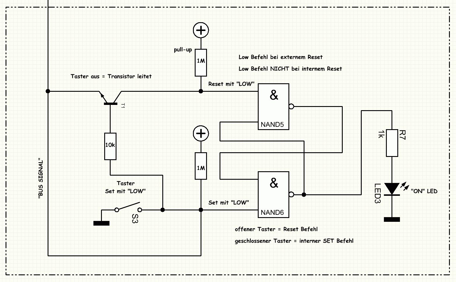 @ Frank Röllen (roelli) >Hmm... vielleicht mittels Transistor den Stromkreis zum Reset-Nand >unterbrechen wenn der lokale Taster betätigt wird? Im Prinzip ja, praktisch anders. Du brauchst ein RS-FlopFlop, wo der SET Eingang Priorität über den RESET hat. Siehe Anhang. C1/R4 sind zu Absicherung des Timings, wenn der Taster losgelassen wird, damit das Signal an IC1B noch etwas länger auf LOW bleibt als das BUS-Signal. MfG Falk