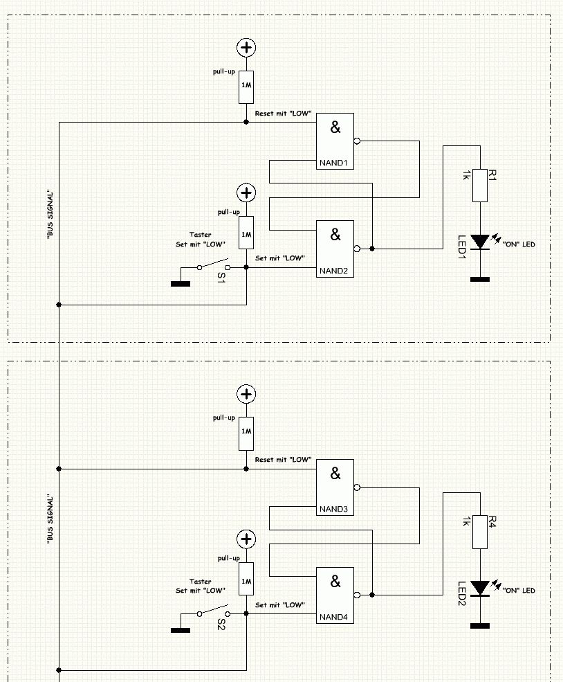 ..die richtige Überschrift für diesen Thread wäre doch wohl eher "Radiobutton mit FlipFlop - Funktionsaufbau"... Du brauchst keinen Bus und auch kein Bussystem. Der Gedanke ist doch der dass der jeweilige Taster sein "eigenes" FF setzt und alle anderen resettet. Das gilt für jeden Taster... Schau dir das Funktionsprinzip eines RS-FF genau an und dann fehlt doch nicht mehr viel... M.