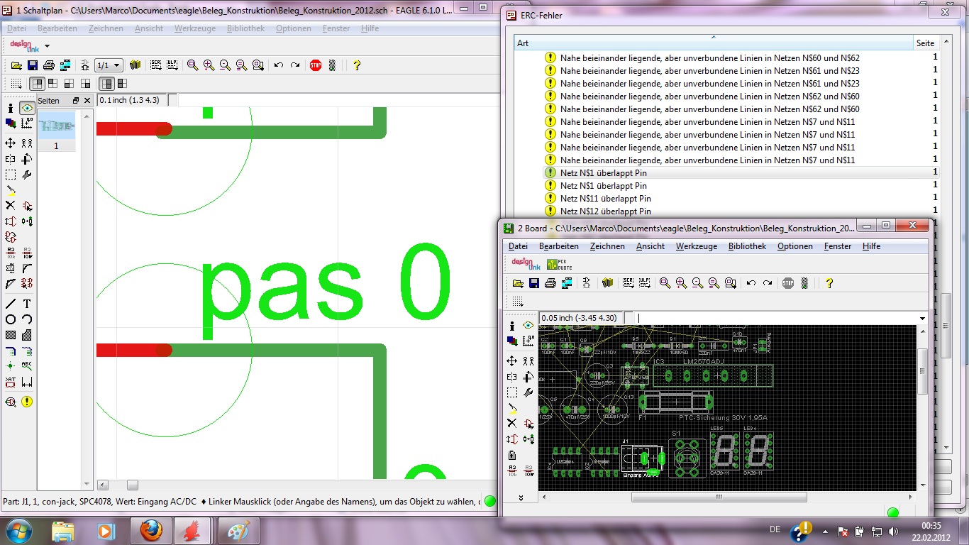 Hallo Leute, ich habe ein großes Problem. Und zwar muss ich bis zum 29.02.12 ein Konstruktionsbeleg abgeben. Hierfür verwende ich das Programm Eagle. Mir muss bei der Anwendung aber der ein oder andere Fehler unterlaufen sein. So sind, wie auf dem Bild erkennbar, leider nicht alle Bauteile auf der Platine miteinander Verbunden, da im Schaltplan auch nicht alle miteinander Verbunden sind, bzw. falsch verbunden wurden. Ich habe leider keinen Hinweis zur Lösung dieses Problems gefunden und bitte daher um Eure Unterstützung. PS: Kann man eventuell die Fehlerliste automatisch beheben lassen? Danke Lieben Gruß Marco