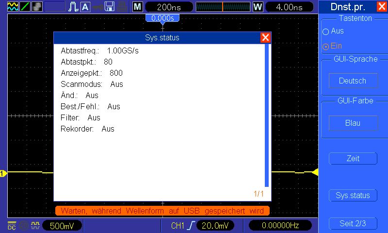 Hallo dunno, anbei ein Bild von der System-Info, direkt nach dem ersten Mal einschalten, also original Voltcraft. Dann ein Bild vom System-Status, aber schon mit Hantek-Firmware. Aber da siehst du bei der Time Base-Einstellung von 4 ns, kleiner geht es im original nicht, beim System-Status oben die „Sample Rate: 1 GS/s“. Das letzte Bild ist wieder die System-Info mit der Hantek-Firmware, die Thomas R. verlinkt hat hier im Thread. Beim durchgehen des Handbuchs und nebenbei probieren, ist mir das DSO hängengeblieben. Da half kein Aus-/Einschalten und die Tasten reagierten nicht mehr. Das DSO-Reset-Tool von Thomas R. hat nicht funktioniert, da die USB-Verbindung nicht hergestellt wurde. Windows XP möchte dann immer Treiber installieren, schafft es aber nicht. Darum würde ich empfehlen gleich den UART-Anschluß irgendwie zugänglich zu machen. Damit habe ich die „ /param/sav/run1kb*“-Datei gelöscht und das DSO reagiert wieder normal. Anbei zwei Bilder mit temporärer Lösung. Peter