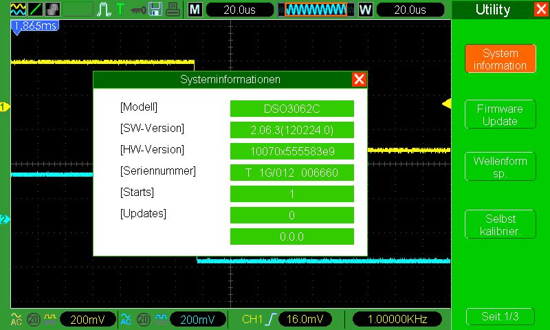Für die Statistik (heute geliefert): - "T 1G"-Seriennummer - 1GS/s laut Menu bei 4ns Zeitbasis - im Backup finden sich ein paar "dst1202b"-Einträge mit Firmwareversion 2.06.3(111216.0) und ziemlich viele "dst1060b"-Einträge mit Firmwareversion 2.06.3(120224.0)