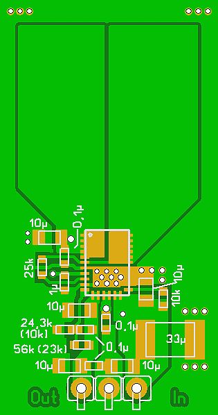 Hallo Gerd, zwei Dinge: 1. Ja, hatte ja nur rund 10Min. unter Last an 2. Mit meinem IR-Thermometer konnte ich nur so ungefähr auf den Chip peilen, das Kupferblech war ja drüber. Da ich dem Ding eh nicht traue, habe ich jetzt noch ein älteres (Made in Germany) DigiThermometer beschafft und mit dem kleinsten Sensor direkt auf dem Chip mit etwas Wärmeleitpaste gemessen. Ich vermute, auch die beiden FETs im Chip brauchen mehr Kühlung (obwohl zum Themaldesign dazu nix steht) und habe jetzt mal die Platine umgezeichnet. Nutzt zwar für die vorhandenen nichts, aber vielleicht gibt es ja eine Nachauflage ;-) Der Micrel ist ja eigentlich ein Zwitter: 1. Schaltnetzteil zur Vorreglung 2. Linearnetzteil für die letzten Volt (letztes 1Volt?) Ich hätte vermutet, das der Linearteil logischerweise Wärme verursacht, der Digitalteil doch eher nicht. Insgesamt werden eh nur rund 1,7 Volt abgeregelt, kann eigentlich nicht viel Wärme entstehen. Schwingen kann ich fast aussließen, zumindest war nichts festzustellen. Old-papa