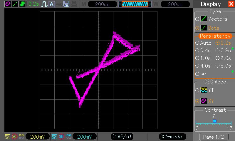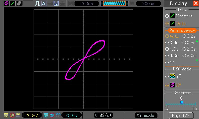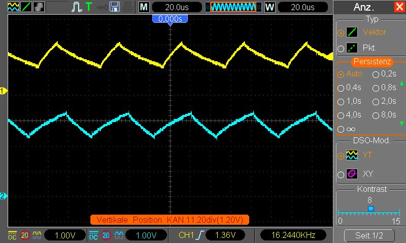 Hallo, Anscheinend habe ich einen Bug in der aktuellen Firmware gefunden (entschuldigung, falls er schon bekannt ist). Wenn man in den XY-Modus wechselt, wird das Signal noch perfekt angezeigt. Schaltet man dann allerdingsDie Persistenz ein, egal welcher Wert, dann wird die Figur aufeinmal Eckig angezeigt. Im Signal YT Bild sieht man die beiden Signale. Die Signale werden von einen Atmega mit einen RC Tiefpass (47R, 1µF) erzeugt. Mfg Pascal