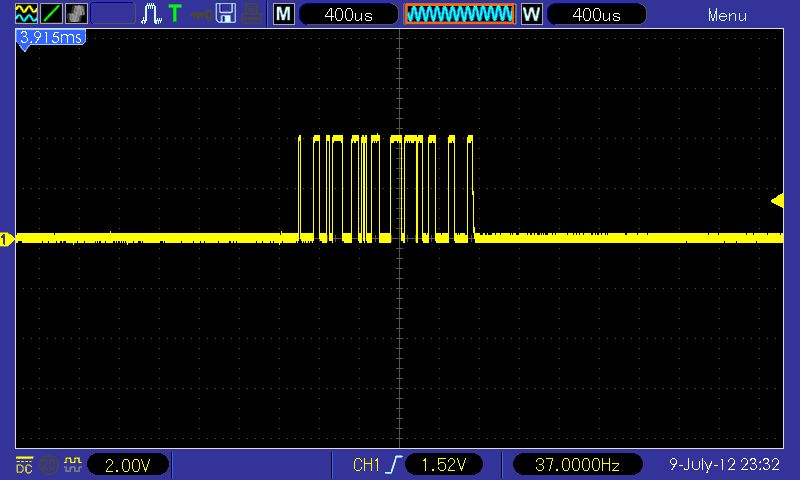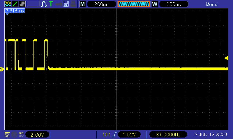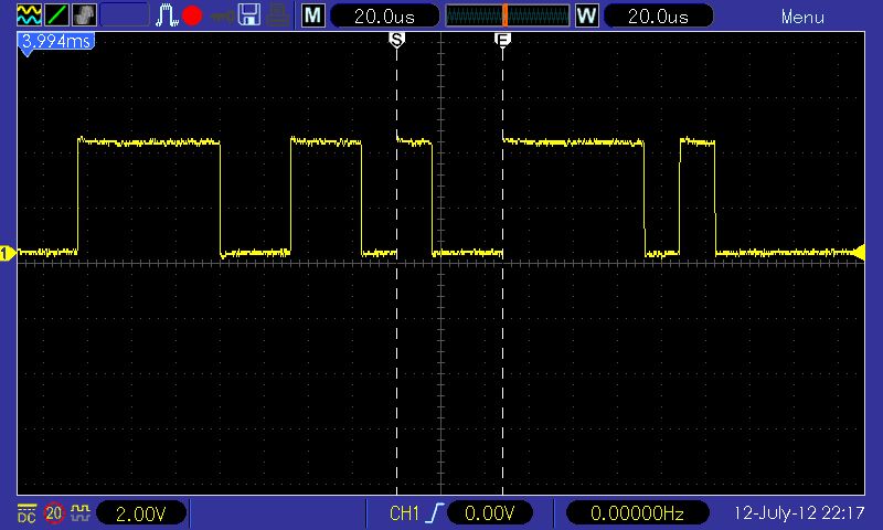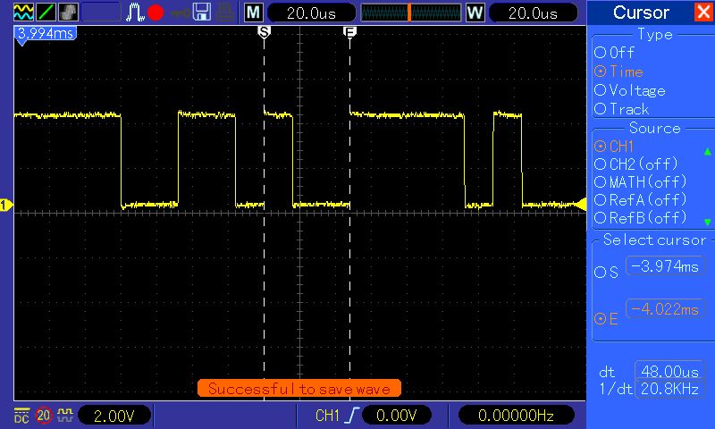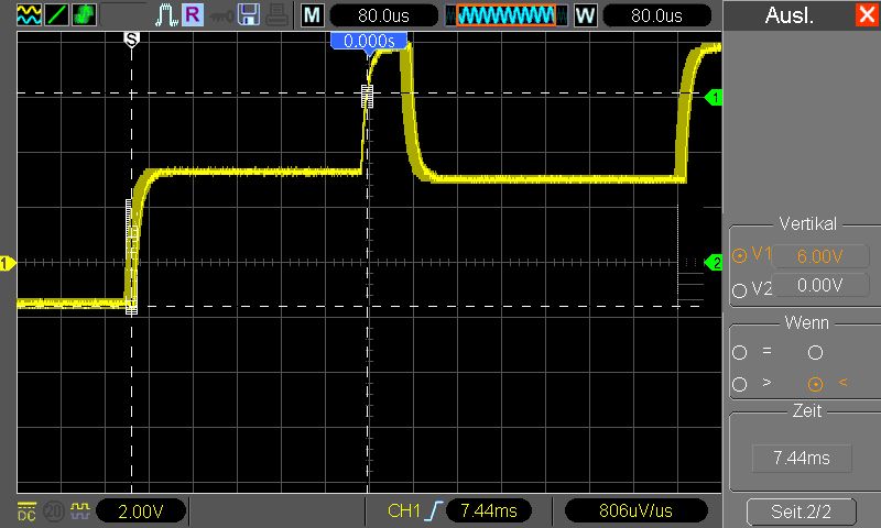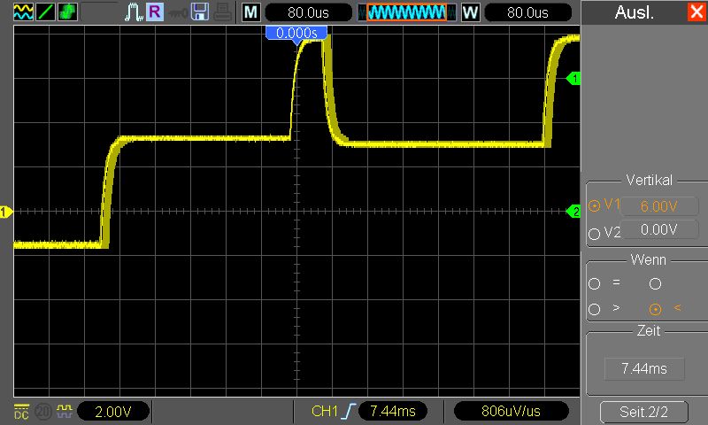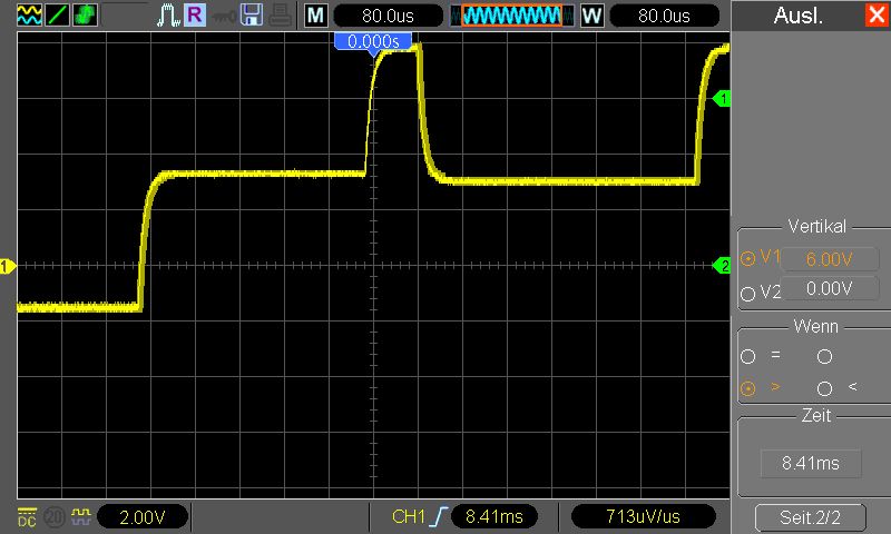 wo soll ich anfangen :) also du hast die waveform im 200us/DIV (es muss 200us/DIV gewesen sein da der kleinste schritt 5us beträgt ... 391*5* us) um 3,915ms verschoben. Nun lass uns checken wie viel speicher (und hier ist es wurscht was du an speicher tiefe ausgewählt hast - da auf dem bild der volle buffer gezeigt wird - die kleine blaue waveform ober deckt ganzes status fensterchen ab) benötigt wird um die waveform um 3,915ms zu schieben .. ups, wir sind schon drüber. Wie kommts? Nun ja, 3915 / 200 = 19,75DIVs. Die anzeige hat 20DIV, die hälfte 10DIV (hälfte als max damit die angezeigte waveform den ganzen billd aufüllt - im stopp mode kannst du es sehen das man es durchaus weiter scrollen kann als die buffer länge). Du bist also 9,75DIV "drüber". Versucht man das selbe allerdings mit 400us/DIV müsste es gehen - tut es aber nciht. Dreht man noch ein schritt weiter (80us/DIV) verschibt sich alles noch weiter. Hmm, nimmt man aber etwas was passen sollte, z.b. im 400us/DIV verschieben um 200us - und dein rein zoomen - beim 200us/DIV passt, 80us/DIV passt, ups ... da (wenn man genau hinguckt) stimmt schon was nicht. Das ganze ist der bug nr. 15 in der liste, den kenne ich schon. So ganz am rande, firmware vom Dez 2009 konnte nach genauen betrachten damit wohl umgehen - hat man max erreicht hat sich die anzeige ( und evt. cursors auch) passend verschoben - sprich wenn irgendwann beim reinzoomen die maximale verschiebung sagen wir 5us war (und nicht wie selektier z.b. 200us) hat die firmware die position automatsich auf position von 5us verschoben (und die anzeige/cursor werte abgedated). Irgendwann hat wihl irgendjemand nicht gedacht das es wichtig ist zu achetn wann der buffer zu ende ist, und schon haben wir so ein schrott drin. Sicherlich wen man weiss das die firmware mit überlauf von buffer nicht umgehen kann, dreht man nicht so weit (oder benutzt dual window mit entsprechend grosseren buffer für main window - DAS ist sowieso viel übersichtlicher - einfach die F7 drücken ...)