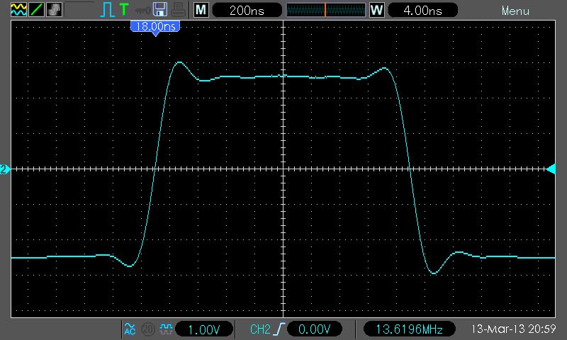 > pulse und frequenzgang des ersten teiles ist zwar nicht egal, aber schon > den ganzen frequenhgang gemessen (nach den umbau natürlich)? Nein, ich hab nur einen 80MHz-Generator (Agilent 33250A). Damit konnte ich noch nicht messen, weil der gerade in einem anderen Messaufbau arbeitet. Was mich aber besonders stört sind die Schwinger am jeweiligen Dachende also "vor" der eigentlichen Flanke. Diese Schwinger dürften nicht sein (so wie beim Agilent). Und mein Hantek DSO5102B (hier im Büro) ist dynamisch auch deutlich schlechter als das DSO3062C. Darauf bezog sich auch mein Ärger weiter oben.