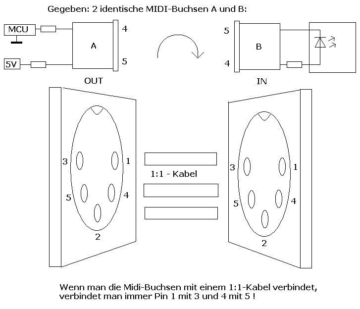 Hallo Simon, der Schaltplan ist nicht korrekt. Am DIN Stecker für Midi-OUT: VCC muss an Pin 4 und TXD an Pin 5. Ich glaube ja, dass dein Projekt funktioniert, aber da muss dann noch irgendwo eine Vertauschung sein, so dass sich das wieder kompensiert. Verbinde mal in deinem Schaltplan Pin 5 vom Midi-In mit Pin 5 von Midi-Out und Pin 4 von Midi-In mit Pin 4 von Midi-Out. Du siehst direkt, dass die Diode im Optokoppler niemals leiten kann... Ich habe vor kurzem selber eine Midi-Interface aufgebaut und wollte mir bei deinem Projekt die Steckerbelegung holen und bin dann stutzig geworden. Beispiele im Netz mit korrekter DIN-Stecker Belegung: http://www.borg.com/~jglatt/tech/midispec/hardware.htm http://www.compuphase.com/electronics/midi_rs232.htm http://www.mactech.com/articles/mactech/Vol.01/01.11/Midi/index.html http://kmt.hku.nl/~pieter/HARD/MIDI2SW/MIDI2SW.html Gruesse SU