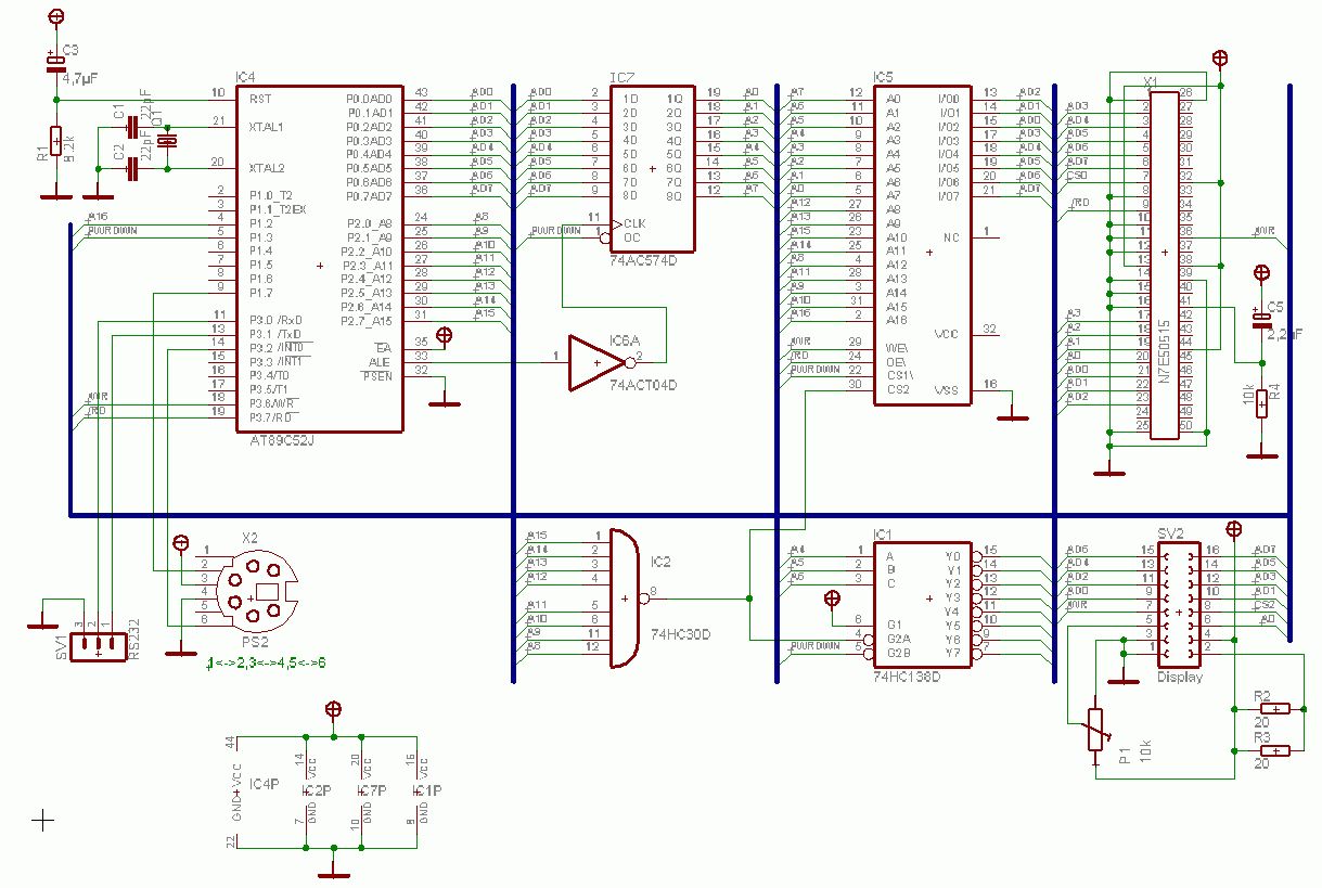 Hier mal meinen aktuellen Schaltplan, wobei der RAM und das Display nicht bestückt sind. Das Display werde ich durch ein Nokia 3310 ersetzen und solange ich bei nur die CF-Karte lese, brauch ich keinen externen RAM. Für die serielle Schnitstelle hab ich früher mal ein Adapter gebaut, der in ein 9pol.SUB-D-Gehäuse passt, daher findet man keinen Wandler auf der Platine.
