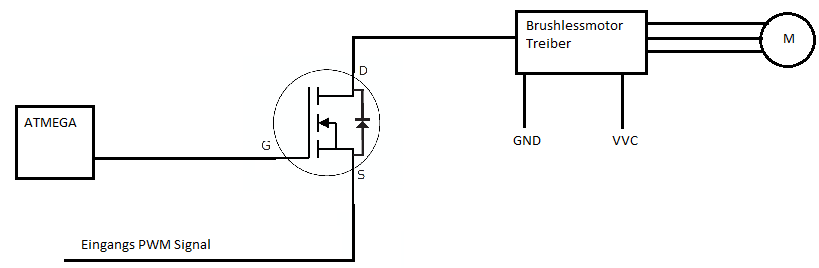 Hallo Leute Von meinem RC Emfänger bekomme ich ein PWM Signal das an meinen Brushlessmotor treiber geht. Dieses signal möchte ich gerne mit einem Atmega runter regeln. Muss ich dazu dieses signal erst mit dem Atmega auffangen und auswerten um es dann wieder per pwm weiter zu schicken oder gibt es eine möglichkeit das Ursprüngliche PWM singal mit einem Mosfet und einer Zweiten PWM runterzuregeln so ähnlich wie in meinem anhang ? Viele Grüße und danke im Voraus !