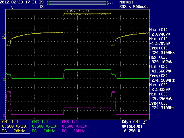 Hallo, ich möchte die Intensität von zwei hintereinander getakteten Leuchtdioden messen. Im Anhang habe ich mal die Spannungsverläufe dazu gemessen. Kanal 1: Spannung über die beiden Leuchtdioden (sie leuchten abwechselnd mit Dunkelphase, Leuchtdioden sind antiparallel geschaltet) Kanal 2: Fotodiode 1 (mit Verstärker dazwischen) Kanal 3: Fotodiode 2 (mit Verstärker dazwischen) Ich möchte mit den gemessenen Intensitäten noch ein paar Berechnungen durchführen, deshalb zwei unterschiedliche Fotodioden. Ich habe die beiden Fotodioden an jeweils einen ADC des XMega128A1 angeschlossen. Ich kann auch schon prima die Messwerte am ADC auslesen. Mein problem ist jedoch das Timing. Ich möchte, dass für jede Leuchtdiode extra etwa 5 Messwerte aufnehmen. Dazu habe ich mir gedacht, dass ich steigende und fallende Flanken erkenne und die beiden Leuchtdioden so voneinander trenne. Meine Frage ist jetzt, kann der ADC diese Flanken erkennen und einen Interrupt auslösen oder gilt das nur für high und low Level? Wenn der ADC diese Flanken nicht erkennt, wie kann ich das ganze System sonst noch triggern? Vielen Dank schonmal im Vorraus! Hendrik