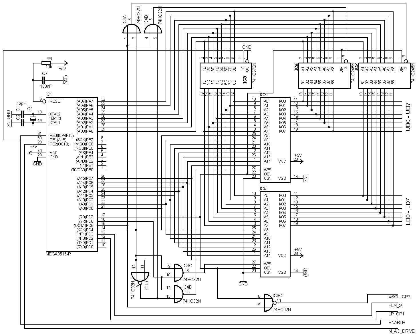 Hier mal ein Foto von meinem Testaufbau. Beide Anschlüsse sind für die CCFLs, denn das LCD hat zwei davon. Der Stecker mit der Buchse ist der heiße Pol, der mit den Stiften der kalte. Die -23V beziehen sich auf die Spannung zwischen +5V und VLCD. Macht also etwa -18V gegen Masse. Da das LCD beschädigt wird, wenn nur VLCD aber keine +5V anliegen, wird diese Spannung vom uC geschaltet. An V- muss also eine stabilisierte Spannung mit etwa -17 bis -18V angeschlossen werden YSCL wird mit LP verbunden. Der 573 kann ein AC, AHC, ALS, F oder sonst ein schneller sein. Ich verwende einen ALS573 aus einem alten Mainboard. Ich sehe gerade, da ist ein Fehler im Plan. Es muss kein 74x32, sondern ein 74x02 sein, da das LCD die Daten an der fallenden Flanke haben möchte. Für den 74x2 reicht eigentlich ein HC. Einen 64k SRAM bekommt man etwas schlecht, aber es sollte auch mit einem 128k SRAM funktionieren. Meiner hat 20ns. Ob der 55ns 128k SRAM von Reichelt auch schnell genug ist habe ich noch nicht getestet, es sollte aber funktioniern, auchn wenn das Timing ziemlich knapp ist.