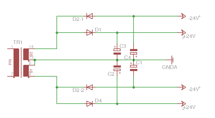 Hallo. Ich habe einen Trafo vor mir liegen aus einem alten Verstaerker. Gerne wuerde ich den Trafo nun fuer ein Gainclone Projekt benutzen, das Problem ist nur, dass die Spannung zu hoch ist. Der Trafo hat einen Mittelabgriff, ob ich diesen oeffnen kann weiss ich nicht - ich habe nicht nachgesehen was unter der aeusseren Folienschicht ist. Mein gedanke war es jetzt den den Mittelabgriff als Masse zu nutzen (wie urspruenglich vorgesehen) und dann die uebrigen Abgriffe mit jeweils einer Delon-Schaltung nochmals zu splitten, damit ich symmetrische Spannungen bekomme. Ist das so moeglich? Ich habe mein vorhaben mal in eagle gezeichnet damit es verstaendlicher wird. --- Ich bin mir bewusst, dass Netzspannung nicht zum spielen da ist, und auch, dass ich so jeweils nur eine Halbwelle bekomme, also staerker sieben muss hinterher. Grusz Flo
