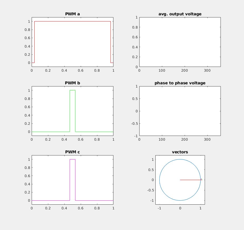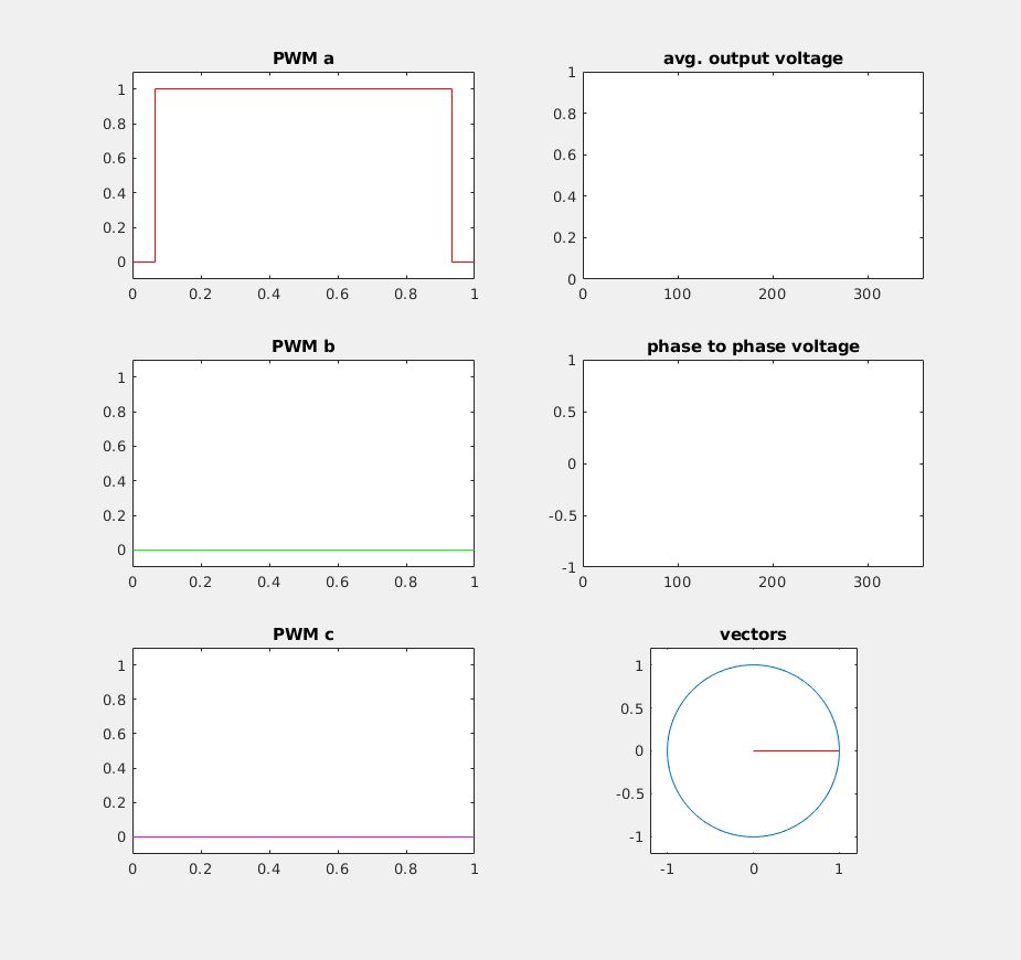 Alexander B. schrieb: > Eine Lösung ist wie du schon sagst den Motor zu bestromen und ihn > einrasten zulassen. Aber wenn du auch noch Hallsensoren hast brauchst du > das doch gar nicht. Die Hallsensoren geben dir doch schon einen Winkel. > Wie du schon gesagt hast kannst du mit den Hallsensoren den Sektor > bestimmen. Und du kannst den Sektor einen Winkel zu ordnen, den Winkel > in der Mitte des Sektors. Und damit initialisierst du den counter des > incremental gebers fertig. Dann hast du in der 1. Umdrehung bis zum 0 > Puls einen Fehler von +-30° elektrisch. Dein nenn Moment beträgt damit > im worst case nur 87%Mn. ach soo, also wenn ich anhand der Hallsensoren z.B. im Sektor 1 bin, dann nehme ich einfach mal an, dass mein Winkel 30° ist. OK klingt plausibel ;-) übrigens habe ich nie richtig verstanden, wie man denn eigentlich nach der inversen Park-Transformation auf die Schaltzeiten der PWM kommt. Ich hab nochmal alles durchgelesen und eine Simulation in Matlab gemacht, womit man die PWM-Signale sieht, sowie die ausgegebenen Spannungsvektoren und die gemittelte Spannung an den Phasen. In der Beilage 2 animierte GIFs, wie das aussieht (Popokurven). Man kann schön die beiden PWM-Varianten unterscheiden. 'popo2.gif' müsste meiner Meinung nach effizienter sein, da dort einer der FETs während 120° gar nie umschalten muss. Die Simulation (m-File, sollte auch in Octave laufen) erzeugt in der alpha-beta Ebene einen rotierenden Zeiger; aus dem Winkel wird der gegenwärtige Sektor bestimmt und die Schaltzeiten für die Vektoren bestimmt. Danach wird der Mittelwert von dieser PWM berechnet und geplottet, und es wird eine Vektoraddition der 3 Einheitsvektoren vorgenommen. Man sieht, wie die Vektoraddition der 3 Ausgangsspannungen wieder den ursprünglichen Zeiger ergibt. Im linken Teil des Plots sind die PWM-Signale dargestellt; oben rechts die 3 Ausgangsspannungen sowie die Spannung am Sternpunkt. Rechts in der Mitte sind die Spannungen zwischen den Phasen, sowie gestrichelt diejenigen Spannungen, die eine inverse Clarke-Transformation ausgeben würde. Würde man eine vektorielle Addition der 3 gestrichelten Spannungen vornehmen, dann käme wiederum genau der selbe rotierende Zeiger heraus, wie wenn man die 3 SVPWM Spannungen addiert. Eine Frage, die ich mir noch überlegt habe, ist, wie man bei der FOC den Motor rückwärts laufen lassen könnte. Würde es dazu wohl genügen, einen negativen Wert für q vorzugeben? den Wert für d belässt man ja bei 0. Grüsse Tobias