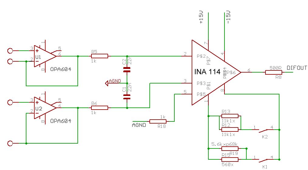 Problem: Nullpunkt Instrumentationsverstärker INA 114 extrem Gainabhängig Habe einen Instrumentationsverstärker mit INA 114 aufgebaut, zwei OPA 604 als Eingangsbuffer davor, da Signalquelle sehr hochohmig (Referenzelektroden Ag/AgCl). Die beiden Referenzelektroden tauchen in Salzwasser, der Massebezug wird durch eine 3. Elektrode (Platindraht) hergestellt, die mit in die Suppe taucht. Problem: Bei Gain 1 des INA ist alles wunderbar. Offset am Ausgang < 30 µV. Schalte ich auf Gain 10, hüpft (auch bei kurzgeschlossenen und auf Masse gelegten) Eingängen der OPA der Ausgang des INA auf 10 mV. Schalte ich auf Gain 100, rennt er auf fast 1 V. Die OPA 604 habe ich dann (nicht im Schaltbild) dann durch drübergelötete Trimmer sauber auf < 5 µV gezogen. Ändert nix am Verhalten. Störungen auf dem Eingang: ca. 1 mV Brumm und ca. 5 mV ss (300 kHz) vom DC/DC-Wandler, der die OPs versorgt. Alle Störungen sind common mode, ich kann sie an allen Leitungen abtupfen. Sind auch so klein, dass eigentlich kein OPamp in die Sättigung gejagt wird.... Was hab ich falsch gemacht? Wäre für einen Tip sehr dankbar.