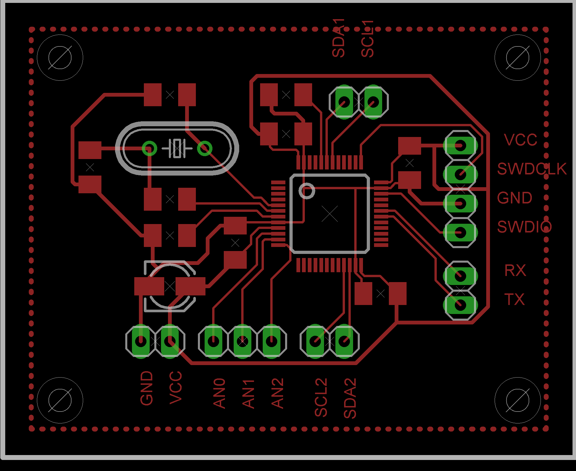 Hallo, ich hab nen Board entwickelt für ein STM32F102CB. Ich möchte mal von euch wissen, was ihr davon haltet. Die Informationen über die Hardware hab ich aus den Datenblättern und Schaltplänen der Entwicklungsboards von ST. Wie sieht das mit der Platine aus? könnte man das noch als Hobby-Bastler mit nem normalen Lötkolben löten oder sind die Bauelemente schon zu dicht beieinander? Ich weiß das einige Sachen nicht ganz optimal sind aber fällt euch noch was sehr wichtiges auf? Moritz