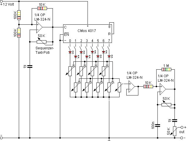 > hier habe ich den Schaltplan her: Der Schaltplan ist fehlerhaft. Nach dem CD4017 darf nicht alles nach Masse gehen, wenn die Dioden entkoppeln sollen. > quietschen aus den angeschlossenen Lautsprechern Der LM324 ist gar kein Lautsprecherverstärker. Da muß noch ein richtiger Verstärker dahinter. Der LM324 ist mit Lautsprechern hoffnungslos überlastet. Das wäre bei dem 50k Poti am Ausgang kein Problem, denn dieses Poti ist sowieso gnadenlos zu hochohmig. Aber all das ist noch lange kein Grund daß ein LM324 abraucht. Das klingt eher danach, als ob die Schaltung schwingt. Was beim Fehlen von Entkoppelkondensatoren, das ist ein 100nF Keramikkondensator direkt von VCC nach GND an jedem IC, auch nicht wirklich verwundert. > Irgendwas stimmt da doch nicht, oder?? Im Internet gibt es vieles, was fehlerhaft ist. Du musst lernen, die Qualität von gefundenem beurteilen zu können. Den Lernerfolg hast du in deiner Facharbeit nicht bestanden.