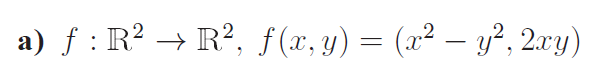 Hallo, ich habe eine Frage zu der Aufgabe. Zuerst einmal verwirrt mich dieses Komma in der Klammer (x^2-y^2,2xy), was hat das Komma zu bedeuten? Wie zeige ich am besten, dass diese Funktion überall differenzierbar ist? Über die RIchtungsableitung? Oder Grenzwert für x und y bestimmen und schauen ob sie übereinstimmen? Gruss Hans