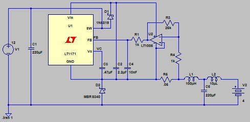 Der Opamp muss muss seinen Bezugspunkt zum GND des LT1171 haben, da er dessen FB-Pin ansteuert. Diese Schaltung könnte man prima mit LTspice simulieren.
