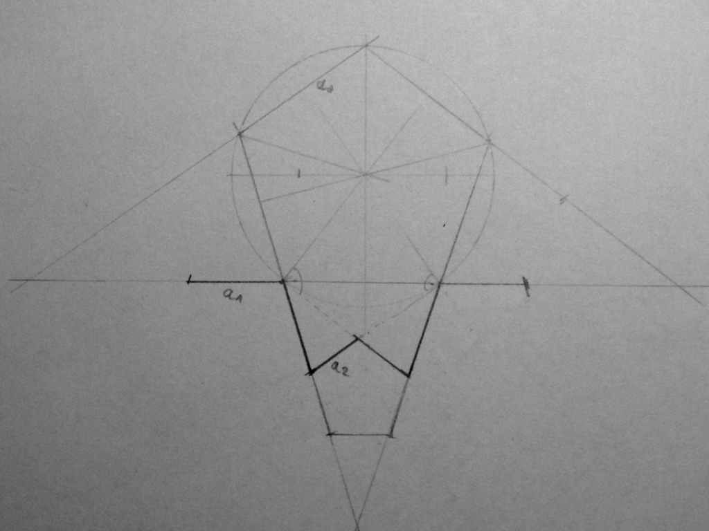 Hallo und vielen Dank für die vielen Antworten! Ich gehe davon aus, das die jeweils kleinere Fünfeckgeneration um den Goldenen Schnitt kleiner ist als der/die Vorgänger. Danke Karl Heinz für die Analyse! Ich will mal klein anfangen und zuerst ein großes Fünfeck generieren, an dessen Kanten sich die fünf "Kinder " befinden. Würde es so machen: Die fünf Eckpunkte (X-Y-Koordinaten) des ersten 5-Ecks festlegen. Das sind auch die "Berühr"-Eckpunkte für die fünf kleineren 5-Ecke. Dann wird es auch schon knifflig, weil die kleineren 5-Ecke ja auch den richtigen Drehwinkel besitzen müssen. Die nächste Frage wäre also: Wie dreht man ein Fünfeck (an einer seiner Ecken) in einer Ebene und was bestimmt den Drehwinkel? Nehme mal an, hier geht es mit Vektorrechnung weiter.