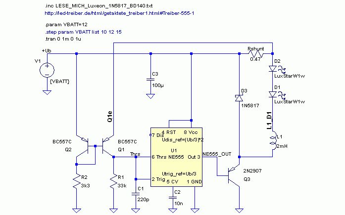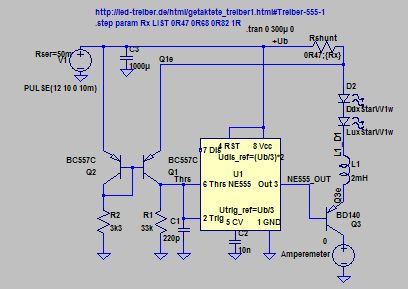 Hallo Dude, wie wäre es wenn Du Dich mit Hilfe des kostenlosen Simualtionsprogramms "LTSpice IV" in die Materie einarbeitest und mit Hilfe der Simulation Zusammenhänge erkennen kannst? Ich hänge Dir mal den NE555-LED-Treiber als Bild und die zugehörigen LTspice-Dateien als ZIP an. LTSpiceIV gibt es zum Download hier: [http://www.linear.com/designtools/software/#Spice] und hier gibt es auch (deutschsprachige) Tutorials, Modelle und Infos [http://www.elektronikbasteln.pl7.de/linkliste-zu-ltspice.html], insbesondere das Tutorial von Gunthard Kraus [http://www.elektronikschule.de/~krausg/LTSwitcherCAD/index_LTSwitcherCAD.html]. Gruss Ottmar