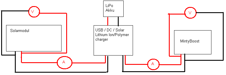 Hallo zusammen, ich bastele zur Zeit ein kleines Solar-Ladegerät für USB Geräte. Ich nutze Komponenten von www.adafruit.com: - Laderegeler http://www.adafruit.com/products/390 - Panel: http://www.adafruit.com/products/417 - LiPo: http://www.adafruit.com/products/353 - USB-Regeler: http://www.adafruit.com/products/14 Dazu findet man in den Foren ja schon eine ganze Menge. Ich hätte für mein Projekt aber gern ein paar rudimentäre Überwachungsfunktion, sprich ich würde gerne aktuelle Werte angezeigt bekommen. Verbauchen Drehspuleninstrumente (nennenswert) Strom? Kann ich die so wie im Schaubild gezeigt einsetzten? Grüße und vielen Dank!