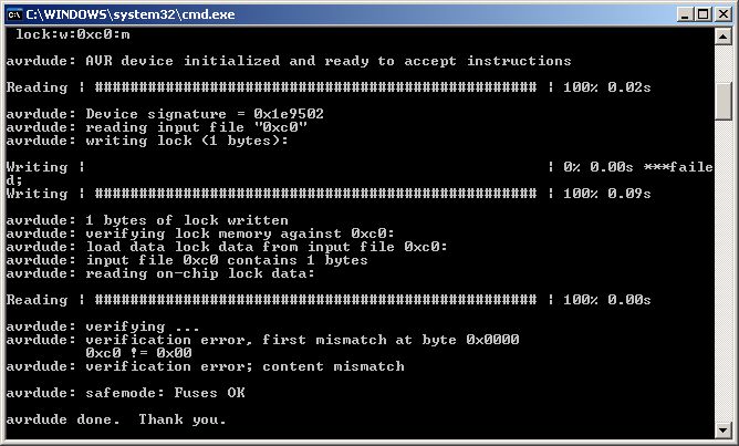 Hallo Leute, ist deise Zeile richtig ?? avrdude -p m32 -P usb -c usbtiny -U lock:w:0xc0:m Ich will den Mega32 vor dem Lesen schützen. Leider bekomme ich von Dude : siehe Bild. Was mache ich falsch ?? Danke