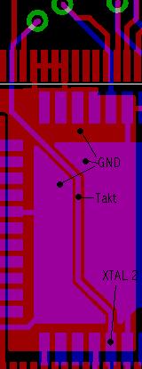 Ersteinmal Danke für die Antworten, ich habe das Layout dann doch nochmal umgestrickt und die Bahn auf fast genau 2 cm verkürzen können. Im Anhang findet ihr den wichtigen Ausschnitt. Masse-Bahnen über die ganze Länge parallel waren leider nicht möglich. Ich hoffe, das ich auch so ein eventuelles Problem hätte beseitigen können. Dank crazy horse bin ich auf ein weiteres Problem gestoßen, dass ich mal wieder vergessen habe. Im Datenblatt des Coolrunner steht, dass die Anstiegszeit max 20ns lang sein darf. Es steht dort leider nicht geschrieben, das für die Clockeingänge etwas anderes gilt (warum baut man da denn keine Schmitt-Trigger ein?). Also habe ich mal eine alte Schaltung mit einem 2313 und einem 8 MHz Piezo-Res. ausgegraben und mit dem Oszi nachgemessen (Bild im Anhang der nächsten Antwort). Eine Anstiegszeit von 20ns müsste steiler sein, soweit ich das ablesen kann, aber mehr gibt mein Oszi nicht her. Desweiteren könnte die Amplitude zu gering sein (für den CPLD). Die Testschaltung lief mit 4.5 V, die geplante Schaltung soll mit 3.3 V laufen. Ist wohl mal wieder Zeit für eine neue Idee... Gruß Henrik
