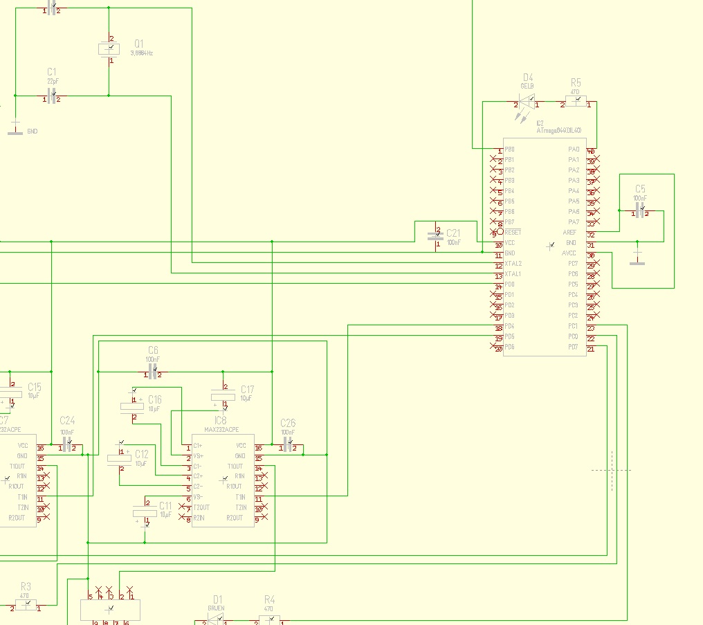 Hier ist ein Teil des Schaltplanes. Max232 habe ich nicht vergessen ;) Die Baudrate muss ja richtig eingestellt sein, da ich ja den selben ATmega mit dem selben Programm verwende.