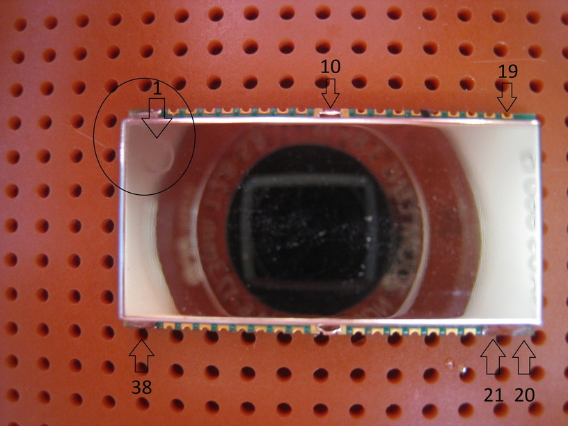 Hallo zusammen, ich versuche mich gerade an meinem Bluetooth-Chip (BTM-222) und bastel mir eine Anbindung an meine restliche Schaltung. Allerdings bin ich mir etwas unklar über die Pinbelegung. Datenblatt des Chips: http://www.taiwantrade.com.tw/resources/member/276716/productcatalog/b9ee22e4-e94a-45cd-8db0-ac88b3a11a75_BTM222%20DataSheet.pdf Ein Foto über die Pinbelegung findet ihr zum Beispiel hier: http://www.robotfreak.de/blog/wp-content/uploads/2008/04/btm-222_schem.png Im Anhang ein Foto von meinem Chip. Man sieht die Markierung auf der Schutzabdeckung des Chips, welche den ersten Pin markiert. Dies ist Ground und mit der Schutzabdeckung kurzgeschlossen (was man auch auf dem Foto sehen kann). An Pin10 kommt wieder GND und auch dieser ist verbunden mit der Schutzabdeckung. Zählt man weiter kommt zu Pins 18 und 19. Beide Ground - diesmal aber nicht mit der Schutzabdeckung verbunden - okay - kann ja sein. Nun wechselt man die Seiten und es kommen die Pins 20 und 21, beschriftet mit USB_DP und USB_DN - allerdings sind diese beiden wieder kurzgeschlossen und mit dem Gehäuse verbunden - das darf doch nicht sein?! Könnt ihr hier etwas Licht ins Dunkel bringen? Ciao, Roland