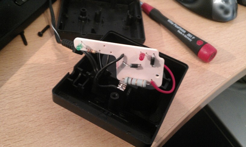 Was ist denn dein Ziel? Hast du schon den Schaltplan aufgenommen? Ich sehe dort nur zwei Dioden für den Gleichrichter (Trafo mit Mittelabgriff?), einen Leistungswiderstand, zwei LEDs und einen Widerstand. Da ist es sehr schwierig eine Volladungsdetektion zu realisieren. Deine Fotos sind übrigens richtig schlecht.
