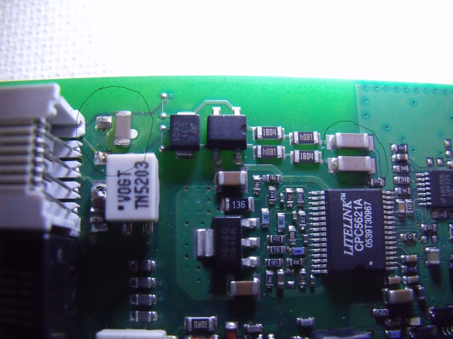 Hallo zusammen. Ich bin neu hier und habe natürlich gleich eine Frage. Warum sollte man auch sonst hier sein :-) Ich hoffe ihr könnt mir helfen. Ich habe ein FritzBox 7170 bei der nach einem Gewitter kein Sync mehr zusatnde kommt. Am Eingang für das Telefonkabel sind 2 Bauteile von denen eines offensichtlich "geplatzt" ist. Das andere sieht heil aus. Ich habe es ausgelötet und mal gemessen. Es hat keinen Durchgang. Leiter ist auf dem Bauteil absolut nichts aufgedruckt. Daher habe ich keine Ahnung was es ist. Kann ja nur eine Sicherung, ein Wiederstand oder eine Diode sein. die Frage ist nur was davon und mit welchen Werten? Gegen eine Sicherung spricht, dass das Teile etwas weiter in der Schaltung noch mal doppelt verbaut ist. So wie es dort aussieht sind die "Dinger" dort in Reihe mit 2 Bauteilen auf denen 1804 steht geschalten. Ich habe es auf dem Bild eingekreist. Wäre schön wenn mir jemand helfen kann. Danke Jan