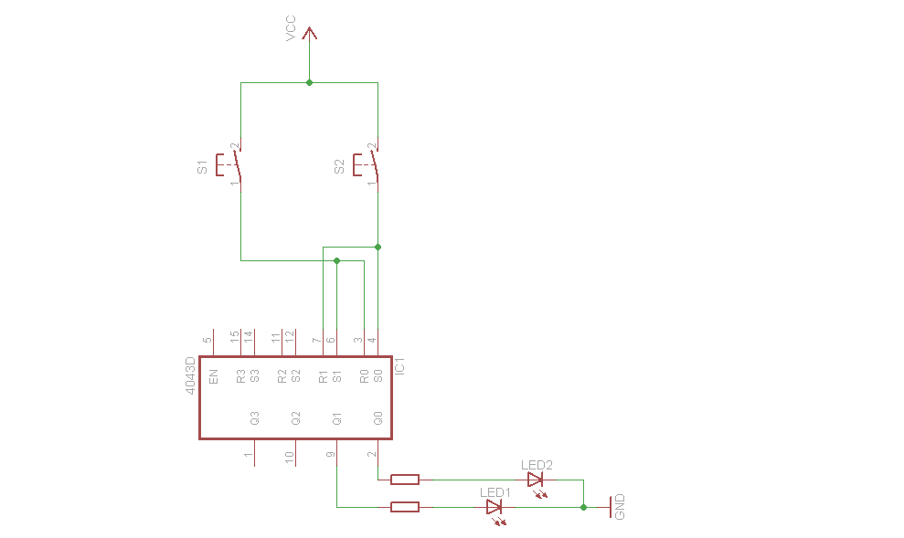 Hallo, Ich fange gerade erst an mich ein wenig mit Mikrocontrollern und Schaltungen etc. zu beschäftigen. Ich stecke nun aber am Flipflop HEF4043 fest. Mein Plan ist es, dass mit den beiden Tastern die jeweiligen Ausgänge gesetzt werden, sodass die LED's leuchten und die jeweils anderen Ausgänge rückgesetzt werden. Leider funktioniert das ganz bisher überhaupt nicht. Ich vermute, dass es daran liegt, dass ich die Eingänge, solange der Taster nicht gedrückt wird, an nichts angeschlossen sind (was laut Datenblatt ja so nicht sein soll). Meine Frage ist jetzt, gibt es eine simple Möglichkeit den HEF4043 zum ordnungsgemäßen funktionieren zu bringen? Entschuldigt bitte wenn die Frage ein weniger sehr anfängermäßig sein sollte, aber wie gesagt, mit solchen Bauteilen habe ich noch nicht sehr viel gearbeitet. Vorab schonmal Danke Gruß Felix