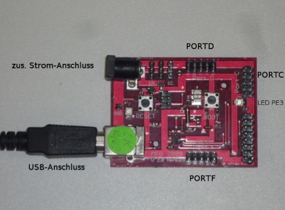 Hallo, Wie schon der Titel sagt bin ich neu in der yC-Welt und habe folgendes Anliegen: Ich habe einen AT90USB1287 auf einer fertigen Platine und muss diesen(studiumsbedingt) mit AVR Studio 4.18 plus WinAVR programmieren. Um zu testen ob der yC auch funktioniert habe ich ein funktionierendes Beispielprogramm erfolgreich kompilieren können und steht nun als .hex file zur Verfügung. Nun möchte ich den Maschinencode mit Flip 3.4 über USB in den Programmspeicher laden und dieser Schritt funktioniert nicht bzw hab noch nicht ganz verstanden wie das auch genau funktioniert. Auf der Platine befinden sich noch 2 Tasten, RESET und BOOT(für den Bootloader nehm ich an). Ein Bild der Platine hab ich angehängt. Ich habe Flip gestartet, den Chip/.hex Datei ausgewählt und als ich bei USB Port Connection auf open geklickt habe, kam die Fehlermeldung: Could not open USB device. Zu erwähnen ist auch, dass ich bei angeschlossenem yC und bei drücken der RESET-Taste wahrscheinlich ein Kurzschluss vorhanden ist, denn kurz darauf wird mein USB-Ausgang wegen zu hohem Energieverbrauch gesperrt. Offensichtlich stimmt was mit der USB Verbindung nicht Könnt ihr mir weiterhelfen? Könnt ihr mir vllt auch erklären wie dieser Vorgang(laden des Maschinencodes in den Flashspeicher) realisiert wird? Was macht ein Bootloader, was macht dieses Flip und wie hängt das mit dem Reset zusammen? Ich hab mich schon auf dieser Seite umgeschaut, jedoch dafür keine präzisen Erläuterungen gefunden. Vielen Dank schonmal!