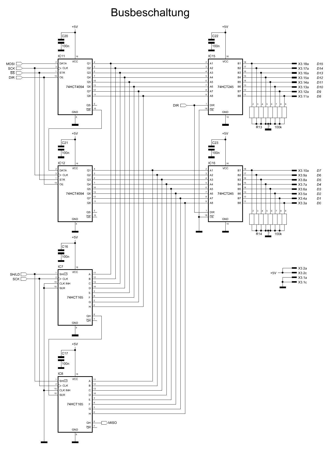 Hallo! Und zwar erstmal was ich vor hab: Ich konzipier grad ein Bussystem für einen Baugruppenträger. Der Bus an sich soll aus 8 Adressleitungen, 8 Datenleitungen und 2 Steuerleitungen bestehen. Über die Steuerleitungen soll eine Art Handshake bei der Übertragung gemacht werden und zwar wie hier: http://www.controllersandpcs.de/pdfs/bussysteme.pdf wie auf Seite 36 beschrieben. Die Baugruppen sind alle über eine Backplane 1:1 verbunden. Zum Schaltplan: Die Dateneingabe und Ausgabe soll mit Schieberegister über SPI gemacht werden. "DIR" gibt die Richtung des Datenflusses durch die 245er vor und schaltet falls das ganze als Eingang fungieren soll die 4094 in den Z-Zustand. Und nun meine Fragen: Wie soll ich die Steuerleitungen am besten ausführen? In Tri-State oder Open-Kollektor-Technik? Die Steuerleitungen müssen ja in beide Richtungen fungieren können. Gibt es falls Tri-State da einzelne Bidirektionale Bus-Treiber? Ich hätte vor die Steuerleitungen dann mit jeweils einem PIN eines AVRs zu verbinden. Kann man das dann so machen, dass im laufenden Betrieb die PINs einmal als Ein- und wieder als Ausgang betrieben werden? Oder hat das irgendwelche Nachteile? Falls die 245er als Eingang fungieren sollen hab ich mir gedacht, da es vorkommen kann, dass kurzzeitig alle Baugruppen auf Eingang geschaltet sein können Pull-Down-Widerstände reinzuschalten, damit dort in diesem Fall ein definierter Pegel herrscht. Denk ich so richtig oder kann man das getrost weglassen? Diese sind hochohmig gewählt, da durch andere Baugruppen da welche parallel geschaltet werden. Gruß Markus