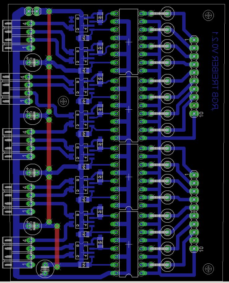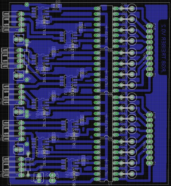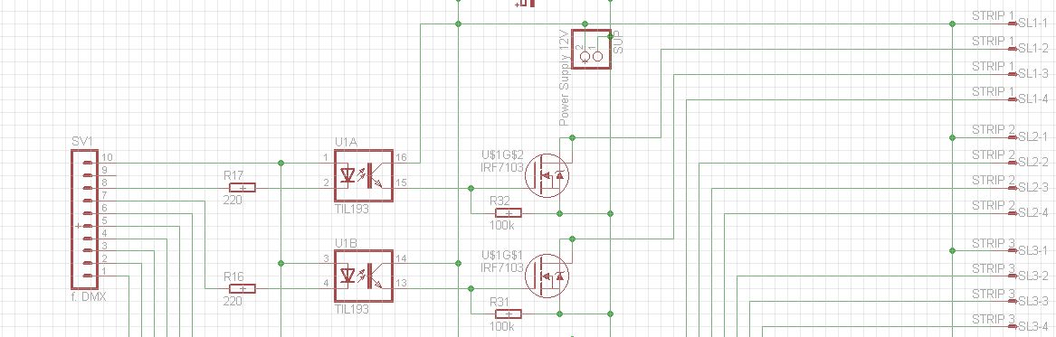Hallo Forum! Nachdem ich das letzte Layout in den Sand gesetzt hab (verfluchtes ULN 2804 Datenblatt!), möchte ich nun eine zweite (oder mehr) Meinung einholen. Also es geht dabei um einen simplen RGB Treiber. Von einem DMX-Modul bekomme ich 16 PWM-Kanäle, mit denen ich 5 RGB Stripes ansteuern möchte. Etwa 500mA Strom zieht jeweils eine Farbe pro Kanal. Einsatz nur im Privaten Umfeld. Der Optokopplerwahnsinn ist eingebaut, da Stripes und DMX Board seperate Netzteile bekommen. (Dieser Punkt braucht jedoch keinen Kommentar) Schaltplan zeigt nur zwei Kanäle, jedoch sind die anderen 14 Stück genau so spannend. Pro Stripe habe ich einen 10µF Elko vorgesehen (siehe Layout). Fragen: - Braucht es noch mehr Kapazität? - Gate-Widerstand bei max 400Hz? - Layout halbwegs ok? (Das erste mal SMD.. oha) Danke schoneinmal im voraus, Michael