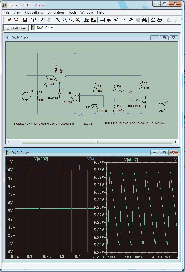 Lothar Miller schrieb: > A. K. schrieb: >> Nur sind es beim klassischen vom Trafo gespeisten Linearregler nicht >> 50Khz, sondern 100Hz, die sich am Ausgang wiederfinden könnten. Genauer gesagt: die 100Hz Ripple, die so ein Regler an der Eingangsseite sieht, können mehr oder weniger gut ausgeregelt werden. Je besser der Regler, desto weniger vom Ripple bleibt am Ausgang übrig. > Richtig, der klassische Sägezahn. Dann wäre es besser, die 10mF /vor/ > den Regler zu setzen... ;-) Das auch. Aber vor allem würde man den Ripple auch mal simulieren wollen. Entweder ganz korrekt mit einer Wechselspannungsquelle, Gleichrichter und Ladekondensator. Oder angenähert, indem man am Eingang eine Gleichspannungsquelle in Reihe mit einer Wechselspannungsquelle hinbaut. XL