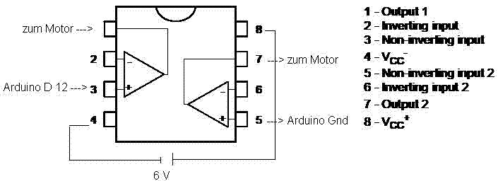 Liebe Elektronik-Begeisterte da draußen, Auf dieser Internetseite hier ist eine Beschreibung des Operationsverstärkers LM358 zu finden mit einer kurzen Beschreibung, dem Datenblatt und einigen Verweisen auf das Forum, die ich sorgfältig gelesen habe. Da ich leider noch nicht besonders viel mit Elektronik gearbeitet hab, bin ich aus all den Informationen aber nicht so recht schlau geworden. Mein Ziel ist die Verstärkung des Ausgangssignals meines Arduino Uno Boards zum Betrieb eines 4.5 V Gleichspannungs-Motors Ich gebe auf meinem Arduino Uno Board am digitalen Anschluss 12 eine Spannung von 3.3 V an Pin 3 des LM358 aus. Pin 5 von LM358 hab ich mit digital Gnd des Arduino Boards verbunden. An Pin 4 und Pin 8 des LM358 hab ich eine externe 6 V Spannungsquelle angeschlossen. An Pin 1 und 7 hängt der Gleichspannungs-Motor. Mit einem Multimeter habe ich die Ausgabe des Arduino Boards an LM358 und die externe Spannungsquelle überprüft und an den Pins kommt jeweils die gewünschte Spannung an. An Pin 1 und 7 wird allerdings überhaupt keine Spannung ausgegeben (auch keine unverstärkte). Habe ich die Pins falsch belegt? Muss ich bei den Anschlüssen auf die Polung achten (entschuldigt bitte, aber ich bin wirklich absoluter Anfänger)? Vielen Dank schon mal für eure Hilfe!