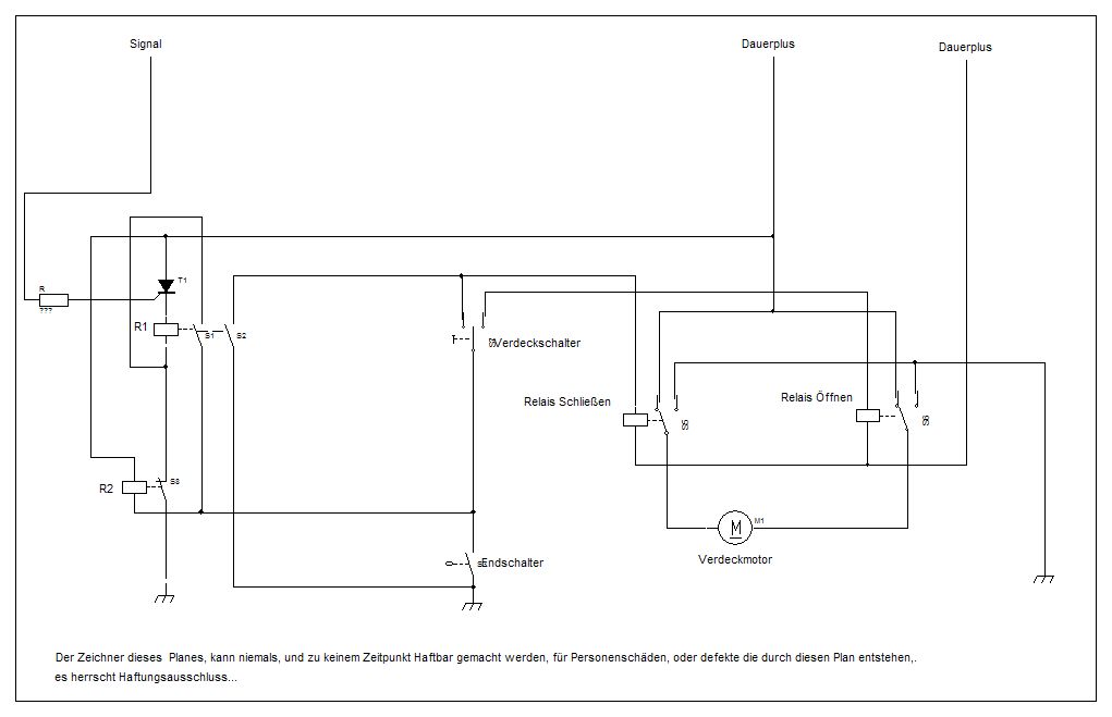 Leider funktioniert deine Schaltung nicht, denn der Endschalter verhindert das. Du musst also weiterhin zum Auto laufen, und dein Verdeck ein Stück anheben. Man muss also den Endschalter "austricksen" Daher habe ich mal selbst ein Plan gemacht. Und zuerst ein Hinweis: Der Zeichner dieses im Anhang befindlichen Planes, kann niemals, und zu keinem Zeitpunkt Haftbar gemacht werden, für Personenschäden, oder defekte, die durch diesen Plan entstehen, es herrscht Haftungsausschluss.... Ich will aber auch nochmal darauf hinweisen, dass der Verdeckschalter und der Endschalter Masse geschalten ist. Der weiteren ist es so, dass das Verdeck im Original Zustand nur mit dem Zündschlüssel funktioniert. Man muss also zuerst dafür Sorgen, dass das Verdeck ohne Zündschlüssel zu öffen/schliessen ist. Ist das in deinem Sinne? Jetzt zu meiner Schaltung: Um den Endschalter auszutricksen, sehe ich nur die Möglichkeit mit einem weiteren Relais. (R2). Und so funktionierts: Du betätigst deine Fernbedienung, der Thyristor schaltet durch, das Relais R1 zieht an. S2 brückt den Verdeckschalter, und den Endschalter. Das Relais "Schließen" zieht an, der Verdeckmotor läuft an. Ist der Endschalter überwunden, gibt er kontakt auf Masse, was bewirkt, das R2 anzieht, und dem Relais R1 die Masse wegnimmt. R1 bekommt aber dennoch Masse, jetzt über den Selbsthaltekontakt S1 und dem Endschalter. Ist das Verdeck geschlossen, schaltet der Endschalter wieder und nimmt dem R1 die Masse, das Relais R1 und R2 fällt ab. Da R2 mit abfällt (Was es tun muß) ist die Zeitspanne um den Thyristor zu löschen wohl zu kurz, vielleicht sollte man diese Relais als Zeitrelais ausführen, so dass der Kontakt, nach Spannungswegfall noch ein paar Sekunden offen bleibt. Wichtig, ist, dass es aber sofort, wenn der Endschalter freigegeben wurde, Einschaltet. Ein Vorwiderstand für das Einschalten des Thyristors ist in meinen Augen von Nöten, wie groß der Sein muss, und welcher Thyristor du brauchst, das muß dir jemand anderer sagen, dafür bin ich zu wenig Elektroniker. Ich habe bewusst den Endschalter als Schalter in meinem Plan eingezeichnet, denn das ist die Position, wie er sich befindet, wenn das Verdeck geöffnet/geschlossen ist. R2 hat in meinem Plan noch ein Nachteil: Auch wenn du von Hand schaltest, egal ob öffnen/schließen, es wird immer mit Anziehen. Hat aber dann keine Auswirkung. Ich hoffe das war Verständlich.