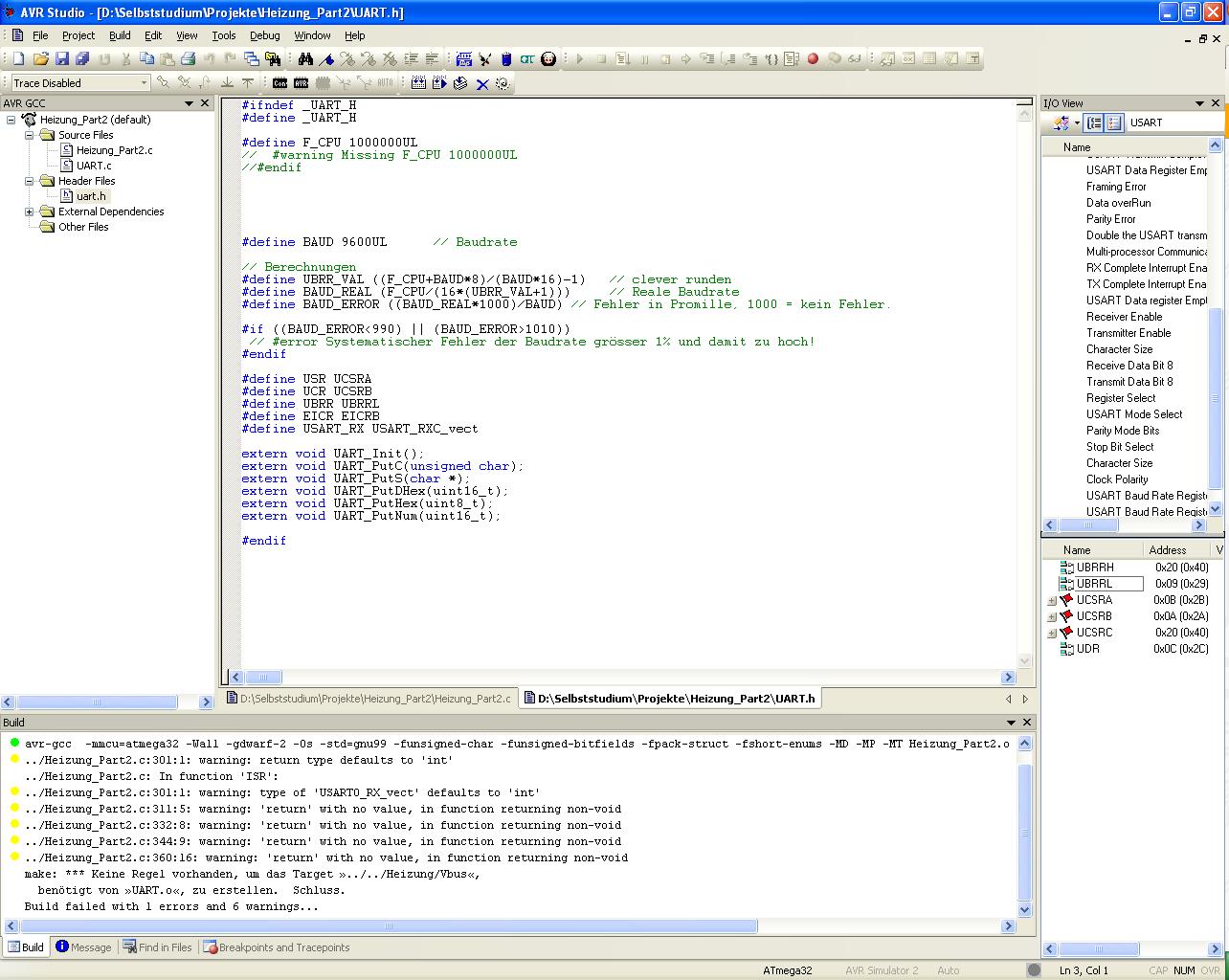 Hallo, ich wollte gerade ein Projekt bilden und bekomme folgende Fehlermeldung: make: *** Keine Regel vorhanden, um das Target »../../Heizung/Vbus«, benötigt von »UART.o«, zu erstellen. Schluss. Kann mir vielleicht jemand sagen, worans liegt? schönen Dank schon mal Thomas