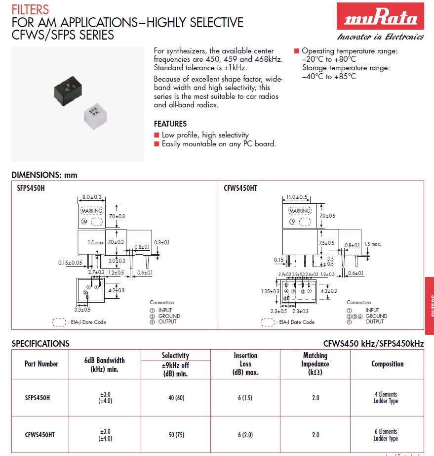>Müssen die einzelnen Segmente denn eigentlich mit >einer Art Weißblechkammern getrennt werden? Nein, es empfiehlt sich aber die Bauteile, welche zum VFO gehören, abzuschirmen. Auch zum Schutz vor Zugluft. Nach einer Warmlaufphase sollte die VFO-Drift weniger als 100Hz in 5 Minuten betragen. > SFP460H (relativ dickes Teil) Das SFP460H wäre imho am Besten geeignet. Murata SFP460H Ceramic filter 6dB Band width (KHz) min =+/-3(+/-4)KHz, Selectivity (dB) min= -9KHz off 40dB +9KHz off (50)dB Insetion Loss(dB)Max.=6 (1.5), 3 PIN Impedanze 2kOhm Könntest Du nach dem original Datenblatt für das SFP460H suchen? Die Spulenfilter sollten sich noch auf diese Frequenz abstimmen lassen. >Kapazitätsdiode ist gut! Die muß lose über einen Koppelkondensator angeschlossen werden mit einer Abstimmspannung über 3Volt (3-8V), sonst ist die Drift zu groß. >Welcher Festwiderstand, R16? Möglicherweise ginge es damit auch. Meiner war in Reihe zu C14. Falls die Ausgangsspannung zwischen 1 und 2 Volt liegt, kann man mit dem C14 variieren. Das funktioniert auch mit 10pF noch. Bernd