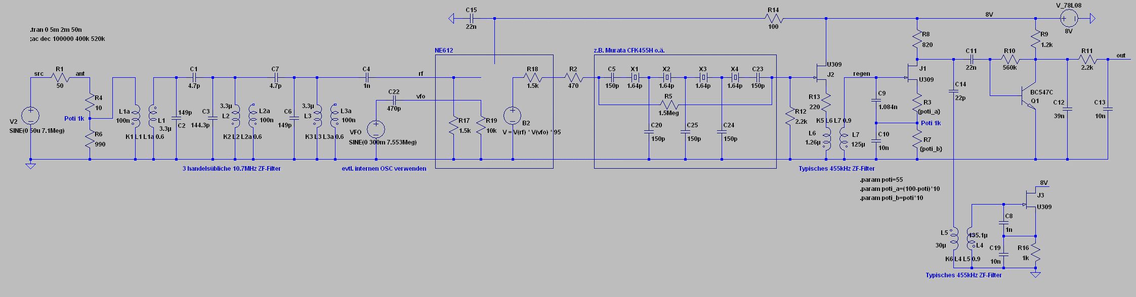 Hier kommt noch der Schaltplan. Da es kein Spice-Modelle von Murata-Filtern gibt, hab ich dieses mit Hilfe eines Ladderfilters nachgeahmt. Es hat 6khz Bandbreite und funktioniert genauso, wie beschrieben. Im Original hatte ich ein Murata SFD455 eingebaut, welches jedoch heute nicht mehr lieferbar ist. Der NE612 ist nur symbolisch dargestellt. Die richtige Beschaltung kann man aus dem Datenblatt entnehmen. Es kommt ja auch darauf an, wie abgestimmt wird, den Abstimmbereich, die Empfangsfrequenz usw. Alle U309 sind eigentlich J310. Der Unterschied ist nicht groß, denn beide teilen sich ein gemeinsames Datenblatt. Eigentlich ist es kein richtiges Audion, denn der Q-Multiplier demoduliert nicht. Dafür ist ein extra AM-Demodulator zuständig. Für AM wird einfach die BFO Betriebsspannung abgeschaltet. Das injizierte BFO-Signal bewirkt am Q-Multiplier eine AM-Modulation, damit hat dann der AM-Demodulator leichtes Spiel. Gruß, Bernd