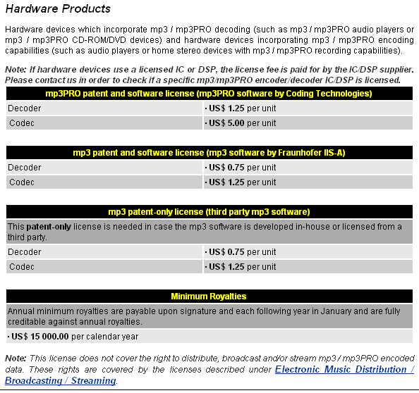 Epoxyd Harzkleber schrieb: >> Echt? Wie hast du das gemacht? >> http://www.google.de/search?q=mp3+license >> http://www.google.de/search?q=vorbis+license >> Jeweils der erste Link beantwortet die Frage. > > Scherzkeks. Hab ich natürlich auch gefunden. Beantwortet aber nicht > meine Fragen. Das war nicht als Scherz gedacht. Entweder habe ich deine Frage vollkommen missvertstanden, oder du hast dir die Seiten nicht im Geringsten angesehen. Was fehlt dir denn noch bei dem hier *************************************************************** What licensing applies to the Ogg Vorbis format? The Ogg Vorbis specification is in the public domain. It is completely free for commercial or noncommercial use. That means that commercial developers may independently write Ogg Vorbis software which is compatible with the specification for no charge and without restrictions of any kind. However, the software packages we have developed are available under various free/open-source software licenses with varying allowances and restrictions. What licensing applies to the included Ogg Vorbis software? Most (but not all) of our utility software is released under the terms of the GNU GPL. The libraries and SDKs are released under our BSD-like license. Note that developers are still free to use the specification to write implementations of Ogg Vorbis licensed under other terms. *************************************************************** und dem angehängten Bild an Informationen?