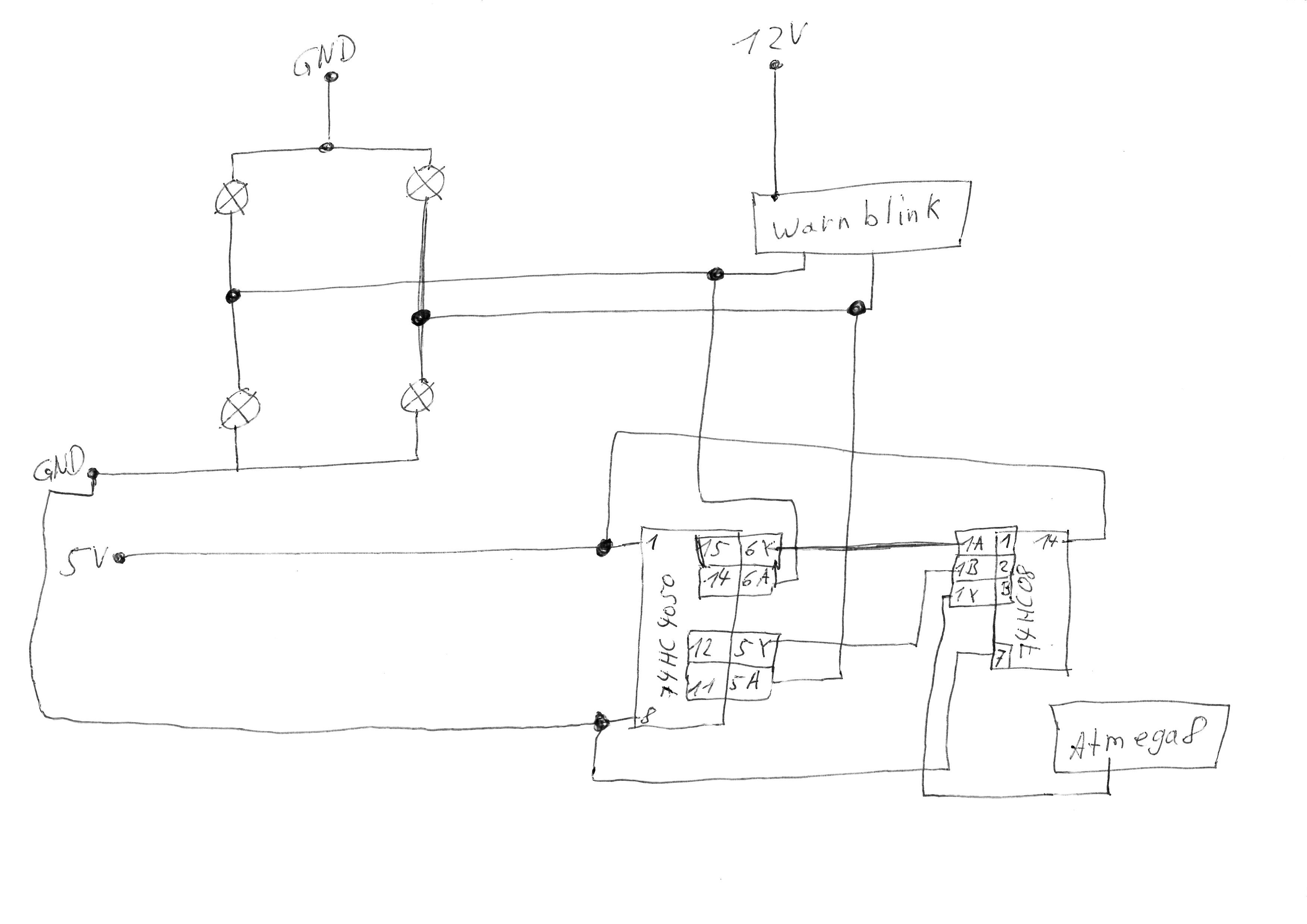 Hi zusammen Ich bin zurzeit dabei eine Schaltung zu entwickeln, die immer dann etwas tun soll wenn die Warnblinkanlage läuft. Dazu soll das 12V Signal von den Blinkerpaaren A und B von einem 74HC4050 auf 5V heruntergepegelt werden. Diese beiden 5V Signale werden dann im AND-Gatter 74HC08 "empfangen". Wenn beide Gleichzeitig 1 sind, wird auf Pin 3 (den Y-Ausgang) ebenfalls ein 1 ausgegeben, welches ich dann im ATmega verwerten kann. 1.) Ist der oben skizzierte Gedankenweg - wenn auch nicht unbedingt der effizienteste - funktionsfähig? Wäre froh um ein kurzes Ja, oder falls ein Nein, dann wieso;) Liebe Grüsse